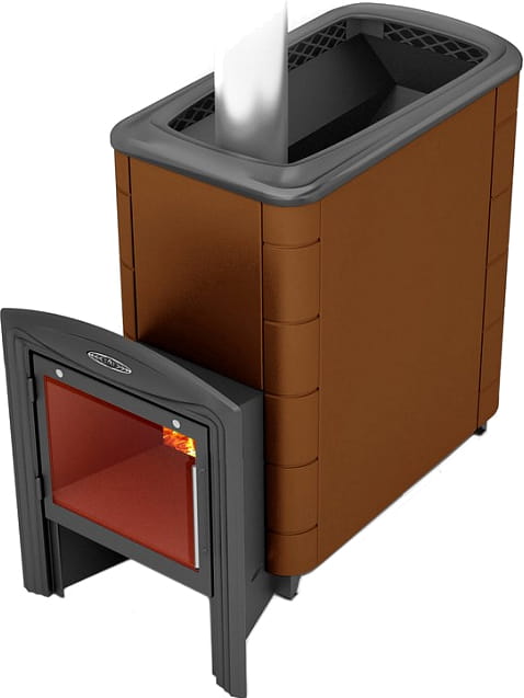 Кожух печи прямоугольной формы со скошенными углами окрашен в терракотовый цвет или цвет антрацит. Модель комплектуется дверцей с экраном "Витра": жаростойкое стекло Schott Robax диагональю 42 см. Дверца вынесена в смежное с парилкой помещение (предбанник, комната отдыха), откуда и производят обслуживание топочного пространства.