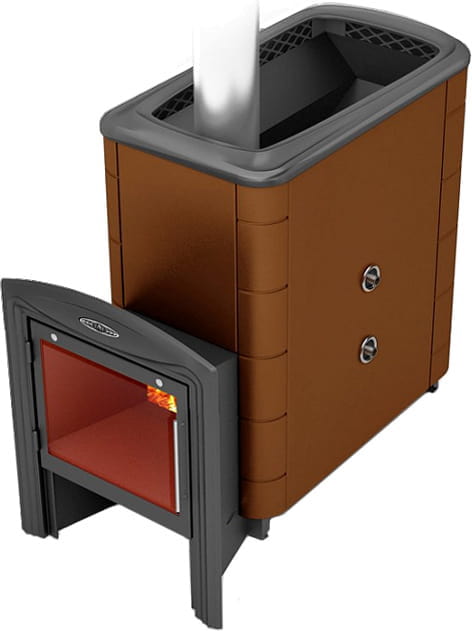 Кожух печи прямоугольной формы со скошенными углами окрашен в терракотовый цвет или цвет антрацит. Модель комплектуется дверцей с экраном "Витра": жаростойкое стекло Schott Robax диагональю 42 см. Дверца вынесена в смежное с парилкой помещение (предбанник, комната отдыха), откуда и производят обслуживание топочного пространства. В конструкции предусмотрен теплообменик для подключения выносного бака горячей воды.