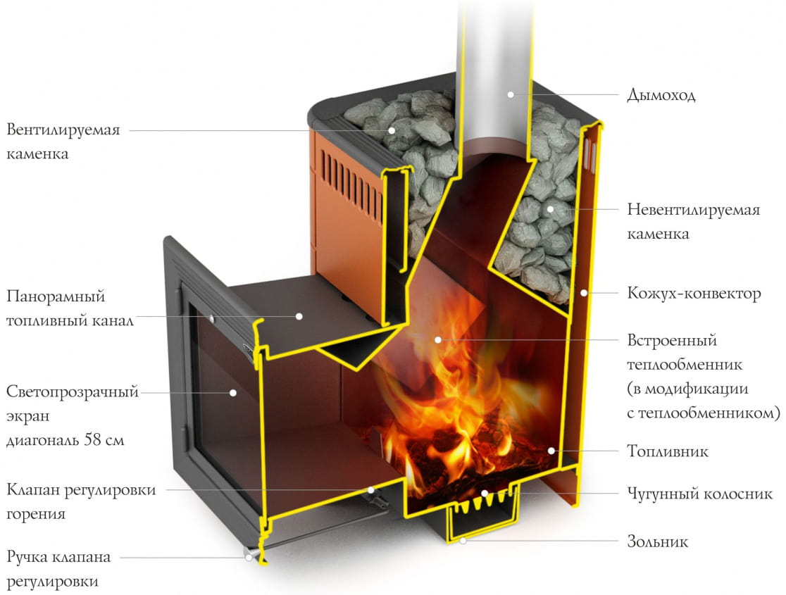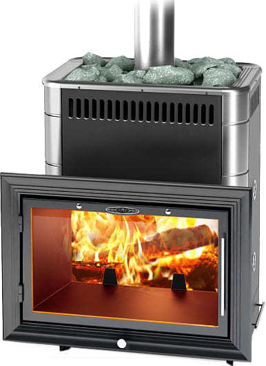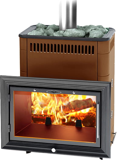 Дверца с топливным каналом вынесена в смежное с парилкой помещение, откуда и производят обслуживание топочного пространства. Зольный ящик открывается в сторону — налево или направо по желанию покупателя. В конструкции предусмотрен теплообменик для подключения выносного бака горячей воды.