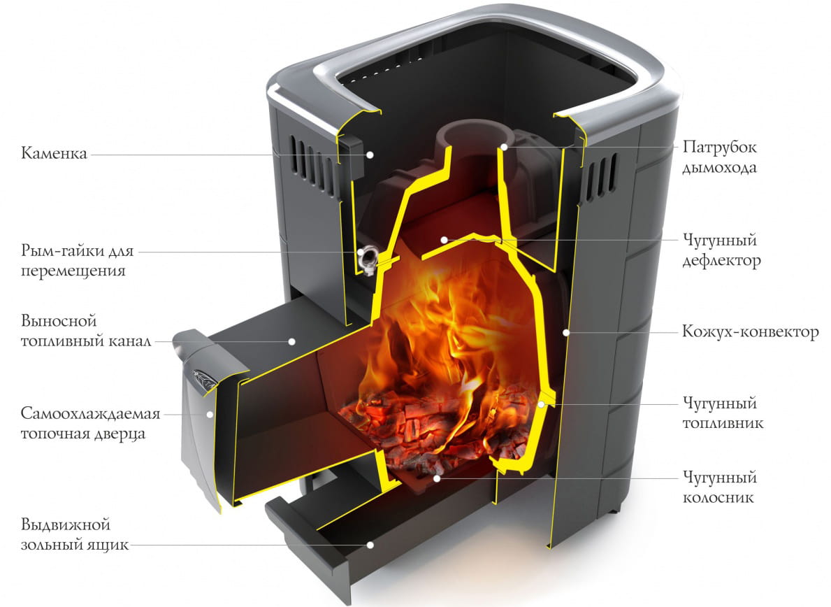 - Тунгуска Cast — всё те же 8—18 м³, но каменка на 36 кг и топка из чугуна.