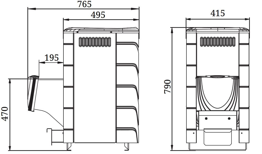 Кожух печей прямоугольной формы со скругленными углами, доступные цвета: антрацит или терракотовый. В серии есть модели, которые топятся как из смежного помещения (предбанник, комната отдыха), так и из парной (устройства с коротким топливным тоннелем). Возможны четыре варианта дверцы:
