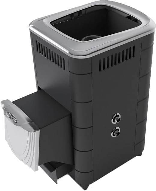 Кожух печи прямоугольной формы со скошенными углами окрашен в цвет антрацит. Модель комплектуется дверцей из нержавеющей стали. Дверца вынесена в смежное с парилкой помещение (предбанник, комната отдыха), откуда и производят обслуживание топочного пространства. В конструкции предусмотрен теплообменик для подключения выносного бака горячей воды.