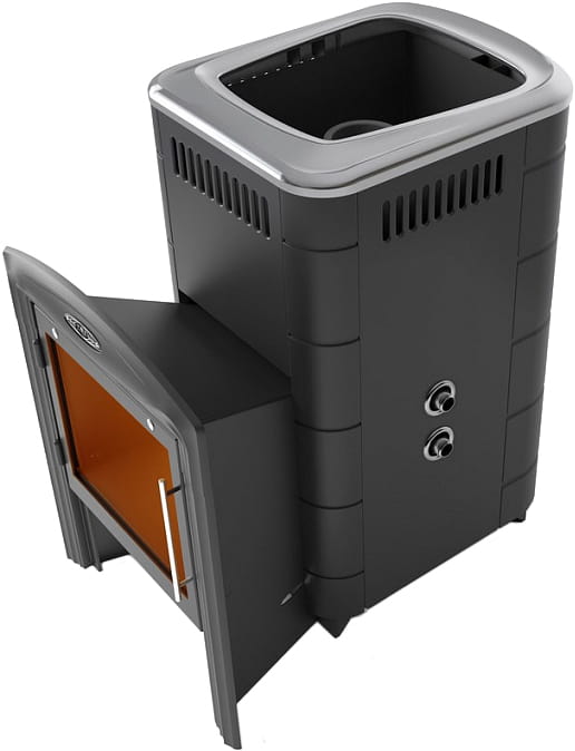Кожух печи прямоугольной формы со скошенными углами окрашен в цвет антрацит. Модель комплектуется дверцей с экраном "Витра": жаростойкое стекло Schott Robax диагональю 42 см. Дверца вынесена в смежное с парилкой помещение (предбанник, комната отдыха), откуда и производят обслуживание топочного пространства.
