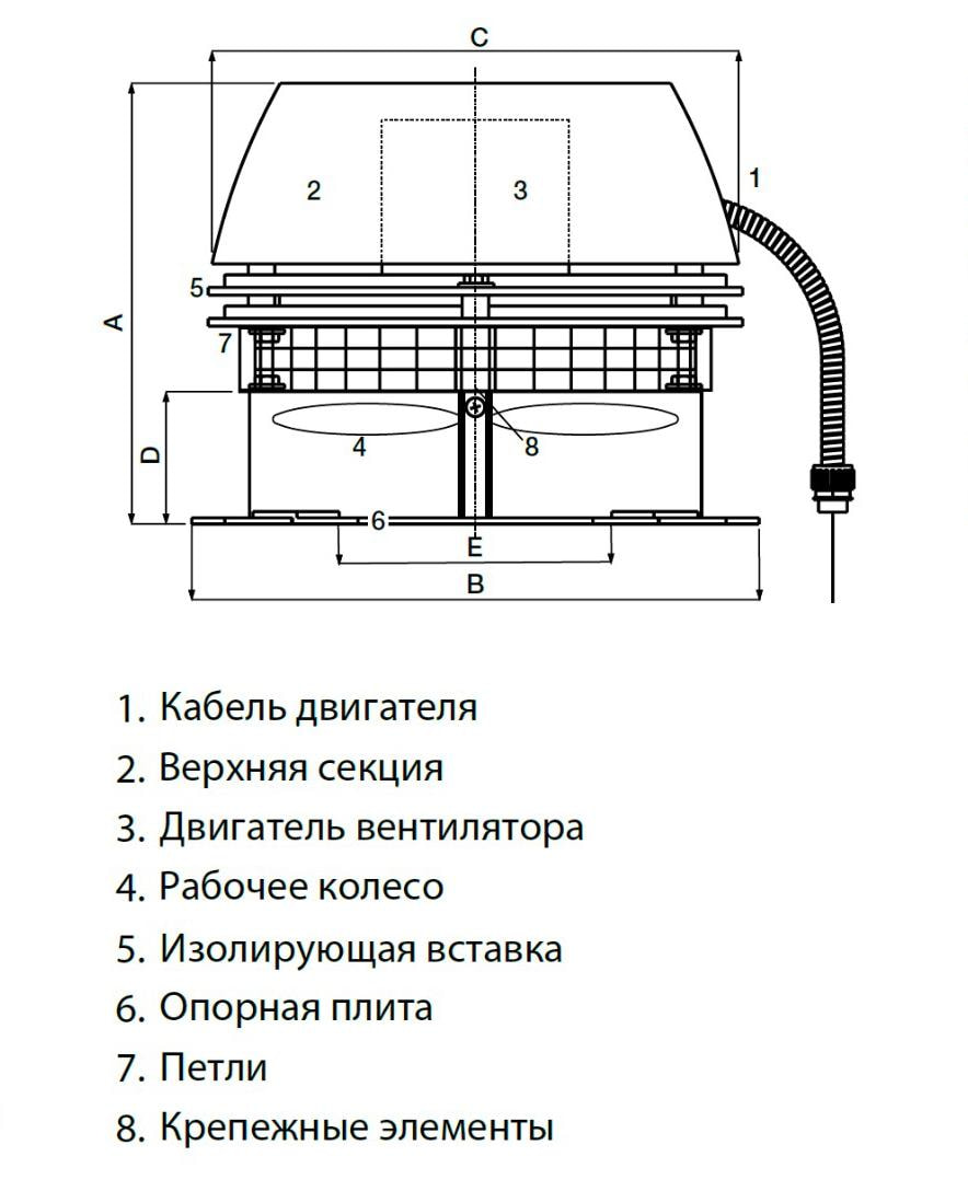 Направление выброса — горизонтальное, монтажная площадка с 4-угольным основанием. Максимальная производительность устройства составляет 3100 м³/ч. Напряжение — 230 Вольт. Макс. рабочая температура газов — 250 °C. Степень защиты мотора — IP54.