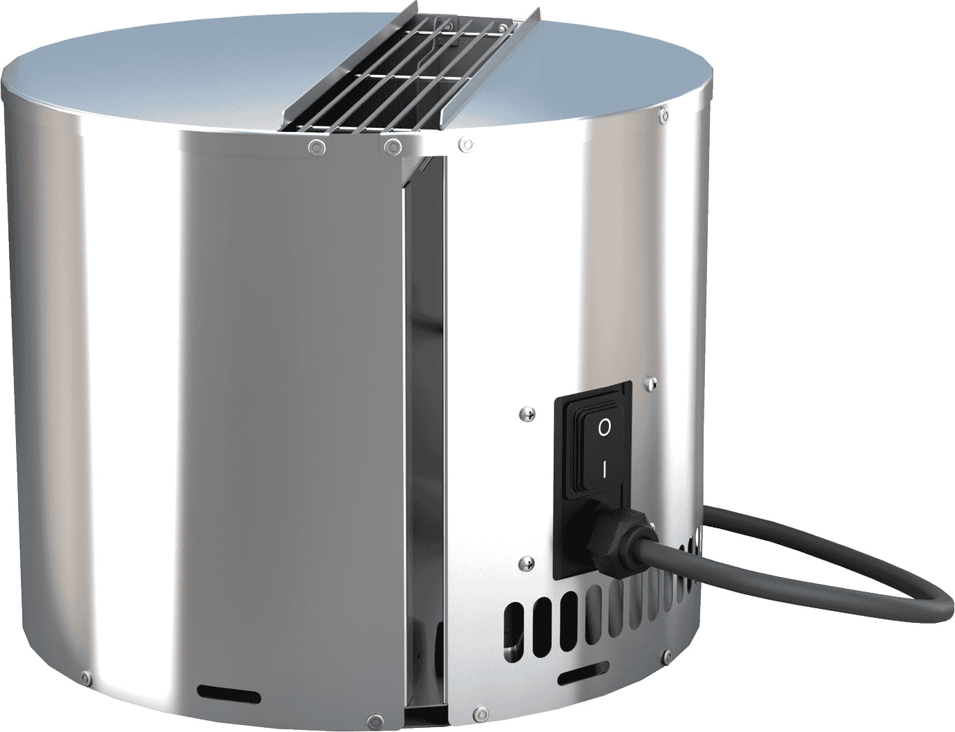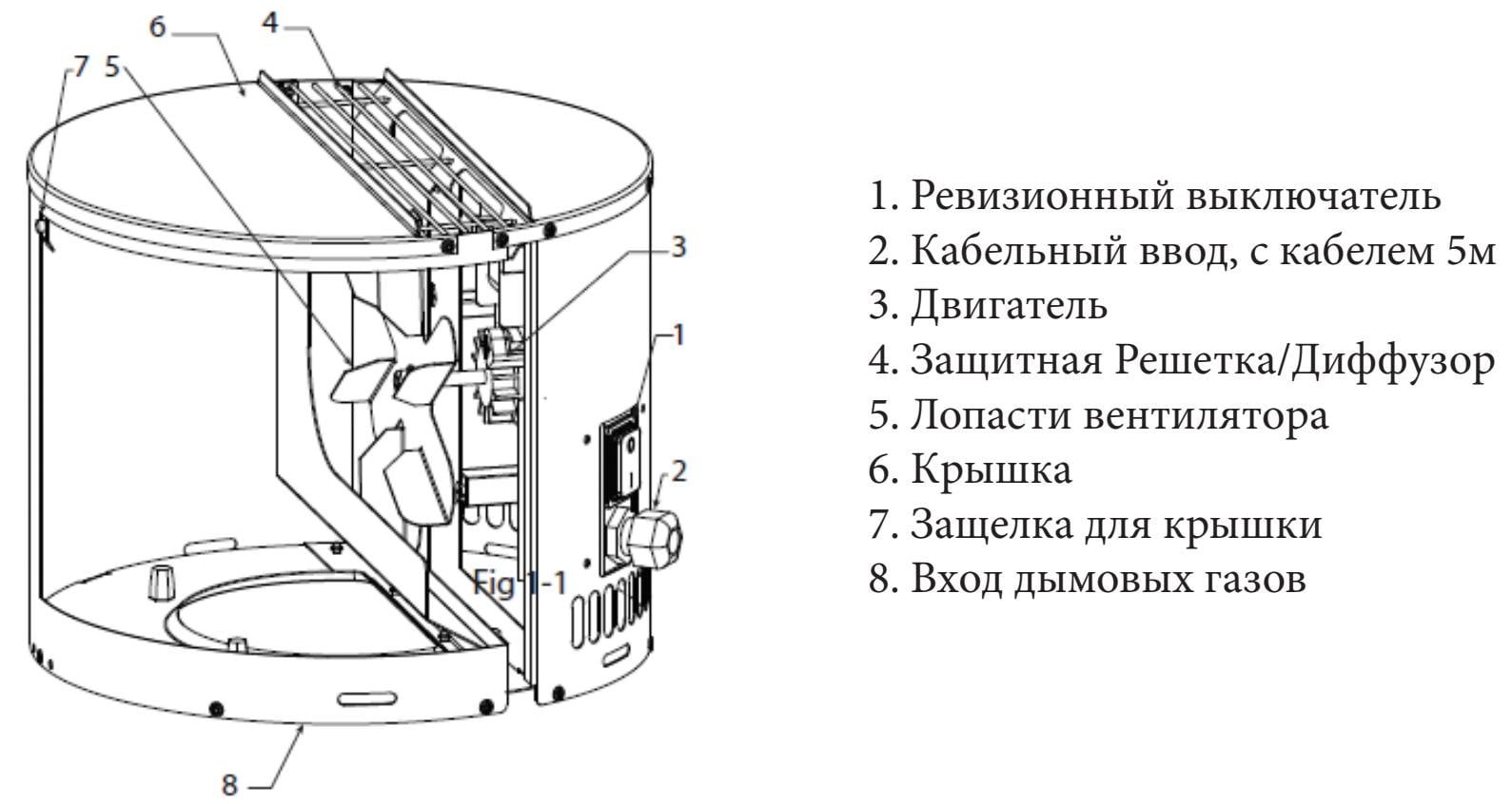 Модель снабжена закрытым огнеупорным двигателем и лопастным мотором, который легко очищается благодаря откидной крышке. Все детали выполнены из нержавеющей стали AISI 304. Дымосос Exodraft Draft Booster RBV1 состоит из следующих элементов: