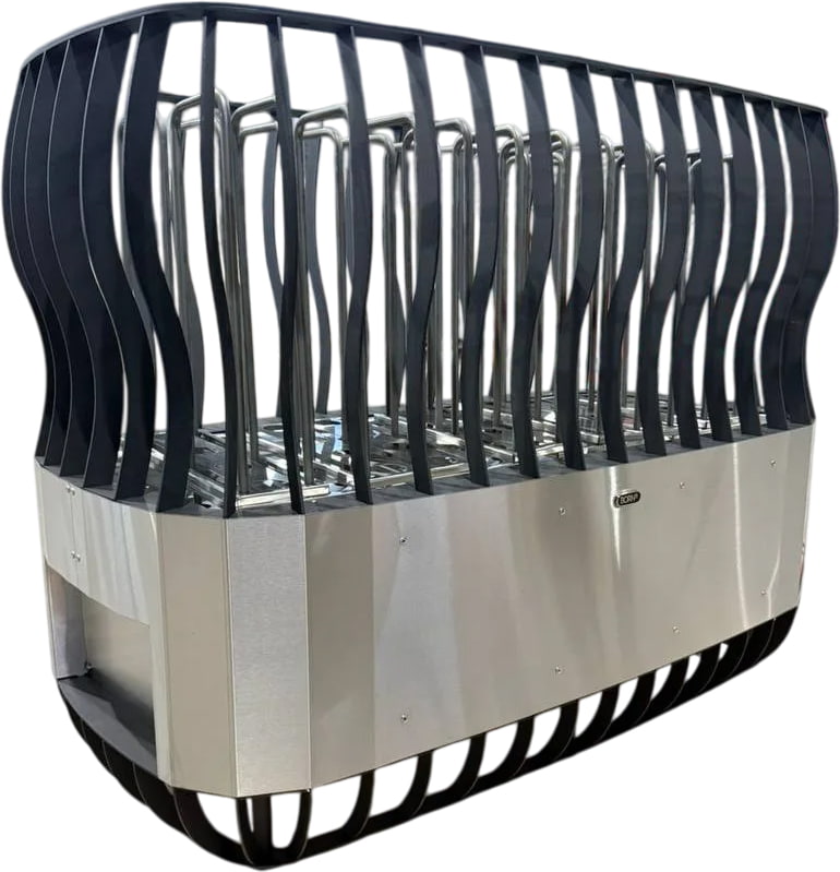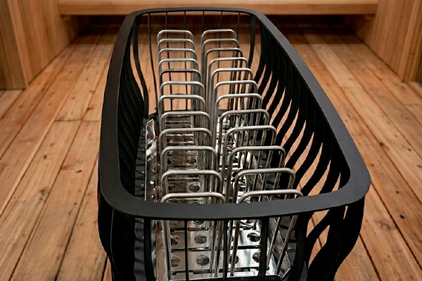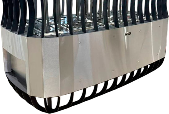 Устройство предназначено для напольного расположения. Двадцать четыре встроенных ТЭНа печи, распределенных по каменке, обеспечат равномерный нагрев камней. Утолщенные ТЭНы рассчитаны на 80-100 тысяч часов работы в максимальной нагрузке. Они устойчивы к воде, однако для дополнительной защиты над контактной группой установлен специальный козырек.