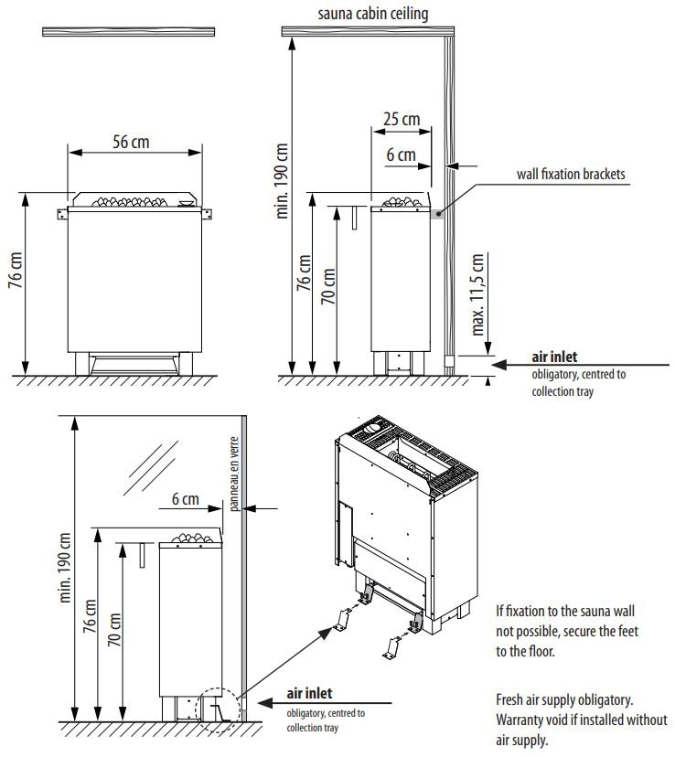 Устройство с напольным расположением и глубиной 250 мм. Корпус имеет прямоугольную форму, внутренняя часть из нержавеющей стали. Кожух окрашен в цвет антрацит или черный. Верхняя крышка печи выполнена из нержавеющей стали. Каменка вмещает 20 кг камней. Встроенная клеммная коробка и опциональная задняя стенка позволяют разместить печь в центре парной или перед фасадом из стекла.