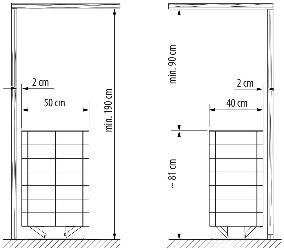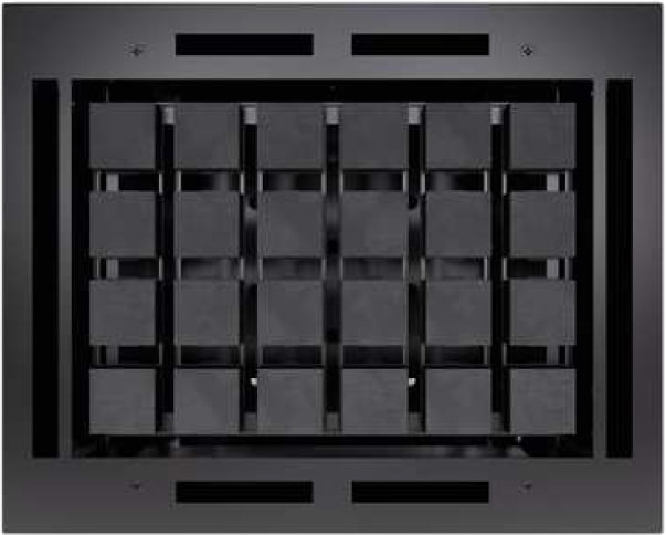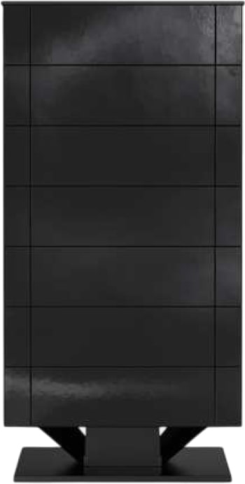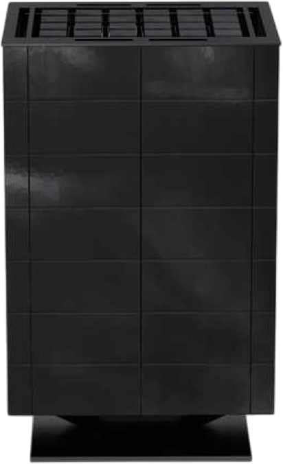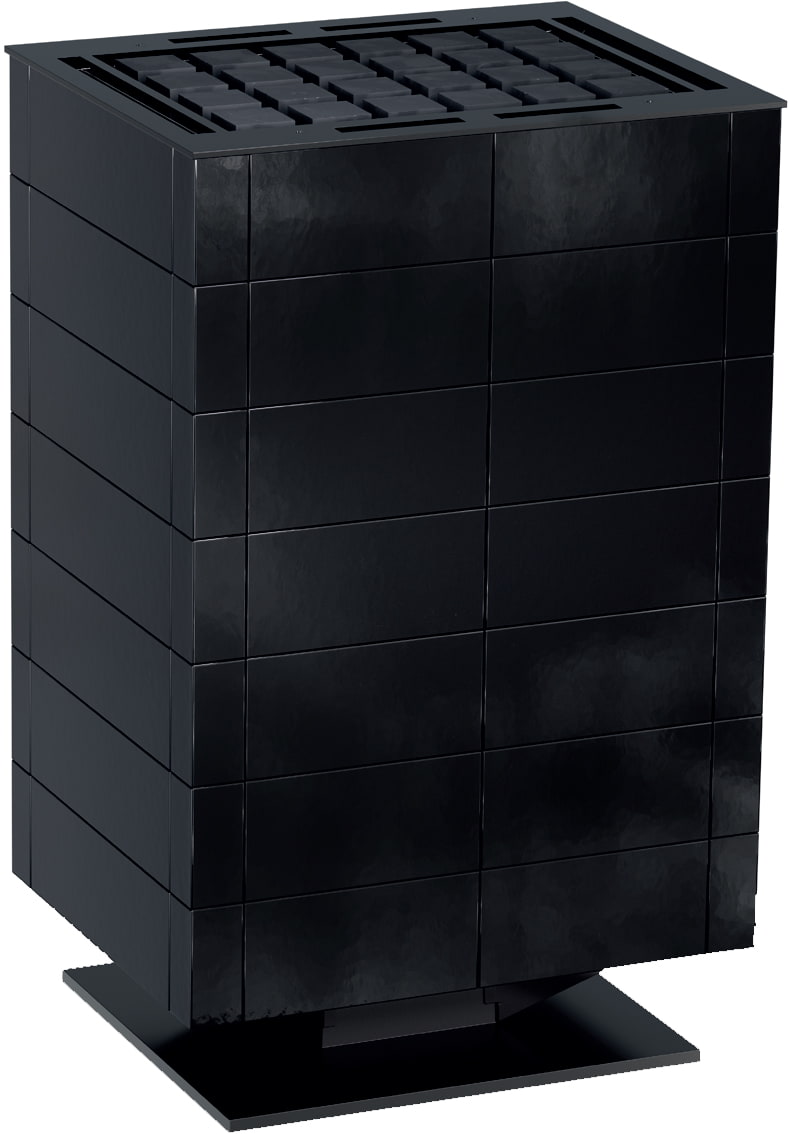 Устройство с напольным расположением. Корпус имеет кубическую форму на ножке, изготовлен из керамической плитки с черным покрытием. Внутренняя конструкция из нержавеющей стали. Плоская задняя панель и встроенная клеммная коробка позволяют разместить печь в центре парной или перед фасадом из стекла.