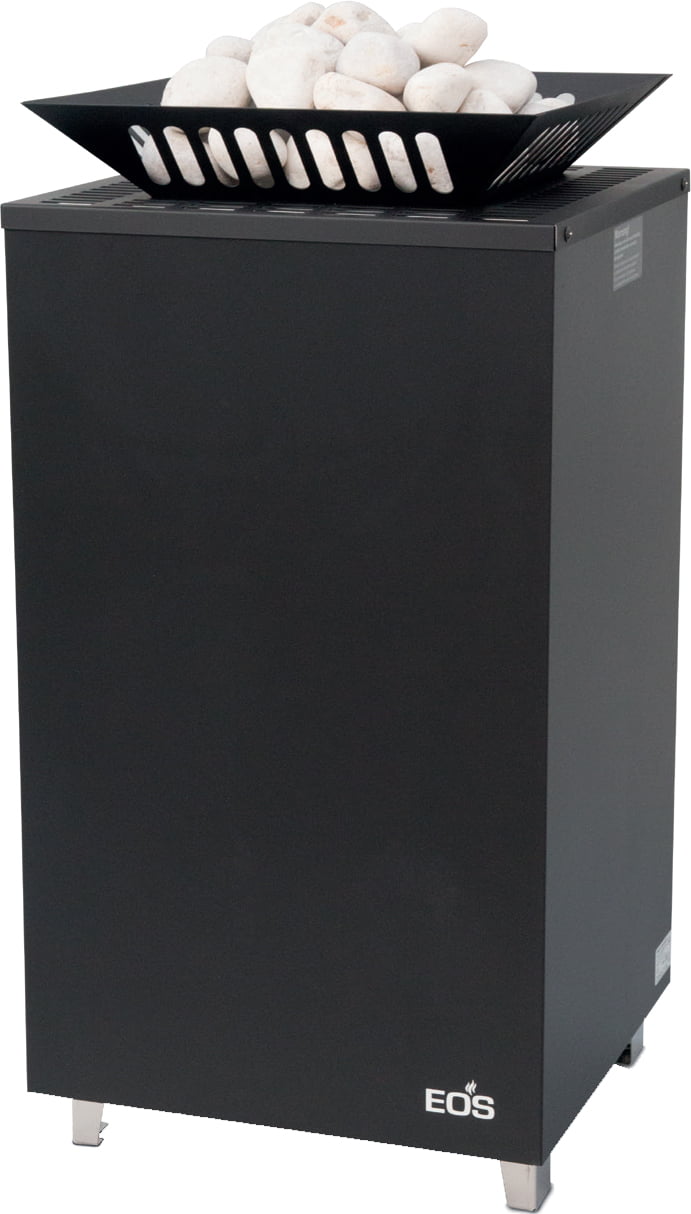 Устройство с напольным расположением. Корпус имеет прямоугольную форму, изготовлен из стали и окрашен в черный цвет. Плоская задняя панель и встроенная клеммная коробка позволяют разместить печь в центре парной или перед фасадом из стекла. Каменка, расположенная над нагревательными элементами, вмещает 25 кг камней. Модель оснащена дополнительной корзиной для камней, в комплекте с которой поставляется 10 кг белого кварца.