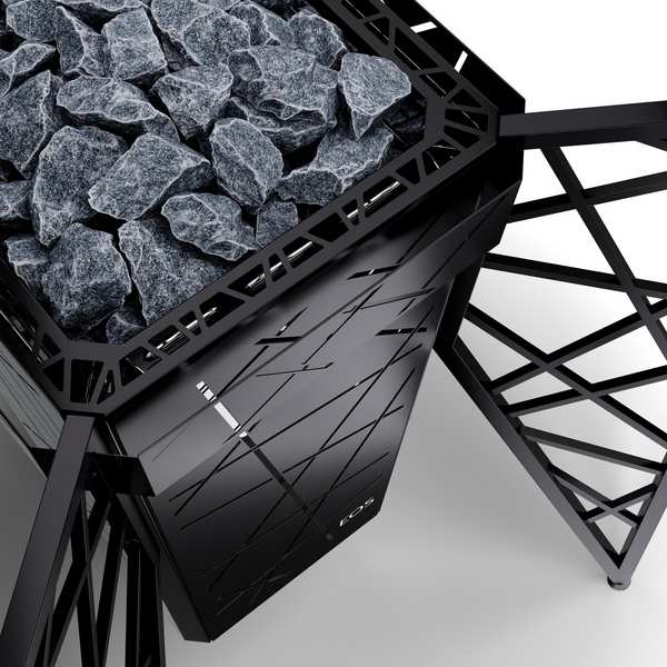 Каменка вмещает 30 кг камней. Камни поставляются в комплекте с печью, разделены на 2 набора по 15 кг: прямоугольные черные из серии EOS Cubius и хаотичные серо-зеленые породы диабаз. Возможна опциональная установка системы безопасности EOSsafe L.