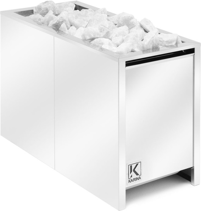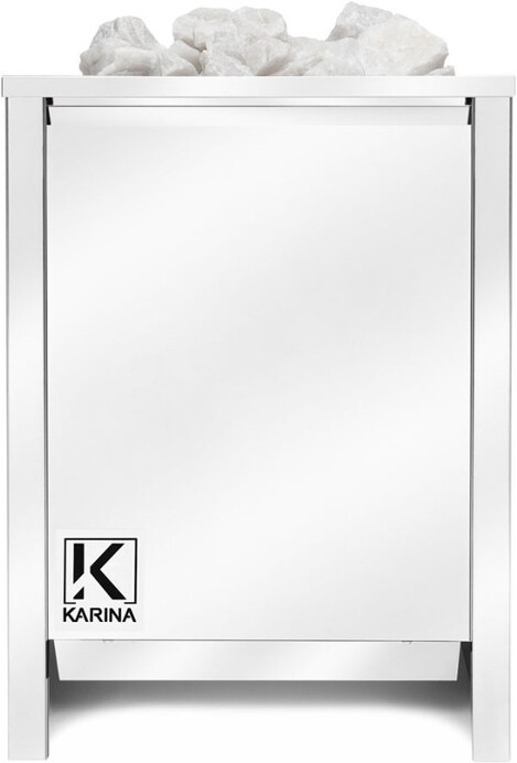 Электрические печи Karina представлены различными по внешнему виду и габаритам моделями: каменки могут быть в виде цилиндрической сетки, стильного прямоугольного кожуха без лишних деталей либо облицованы натуральным камнем. Кроме эстетического вида, облицовка защищает от жесткого инфракрасного излучения внутреннего разогретого электронагревательного блока и увеличивает теплоемкость. Материал отделки представлен плитами камня: амфиболит, змеевик, онего грин или талькохлорит.
