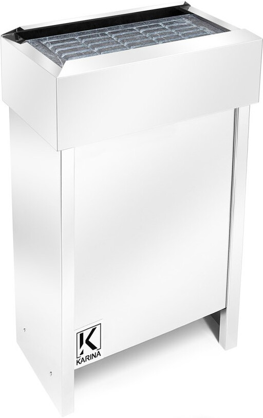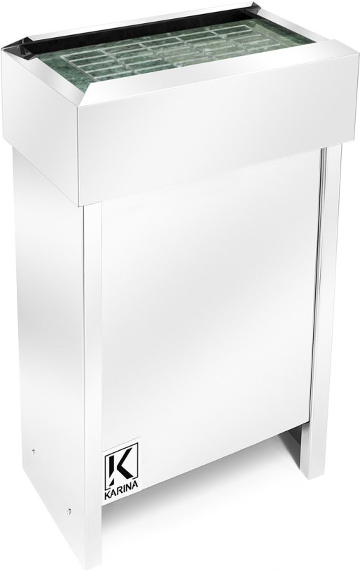 Электрические печи Karina представлены различными по внешнему виду и габаритам моделями: каменки могут быть в виде цилиндрической сетки, стильного прямоугольного кожуха без лишних деталей либо облицованы натуральным камнем. Кроме эстетического вида, облицовка защищает от жесткого инфракрасного излучения внутреннего разогретого электронагревательного блока и увеличивает теплоемкость. Материал отделки представлен плитами камня: амфиболит, змеевик, онего грин или талькохлорит.