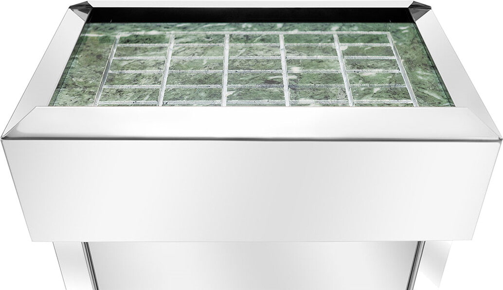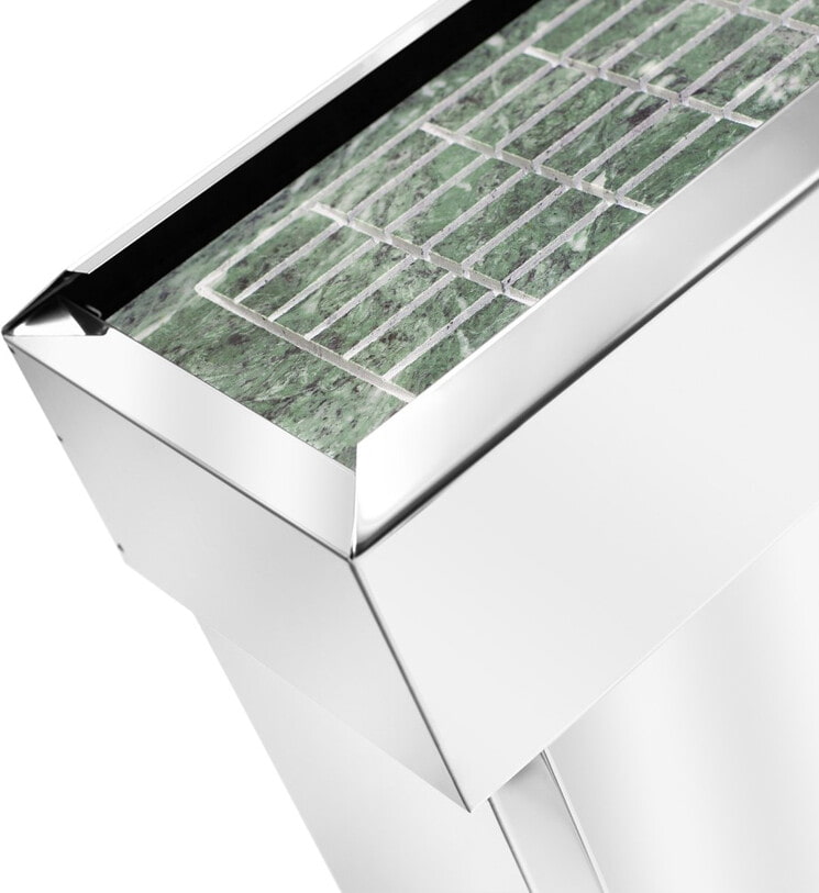 Устройство с напольным расположением. Корпус изготовлен из нержавеющей стали в форме вертикального прямоугольника. Каменка открытого типа вмещает одну плиту из натурального камня змеевик или талькохлорит весом в 15 кг (поставляется в комплекте). Электропечь требует подключения блока управления, который приобретается отдельно.