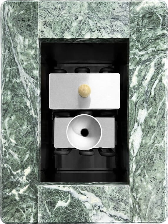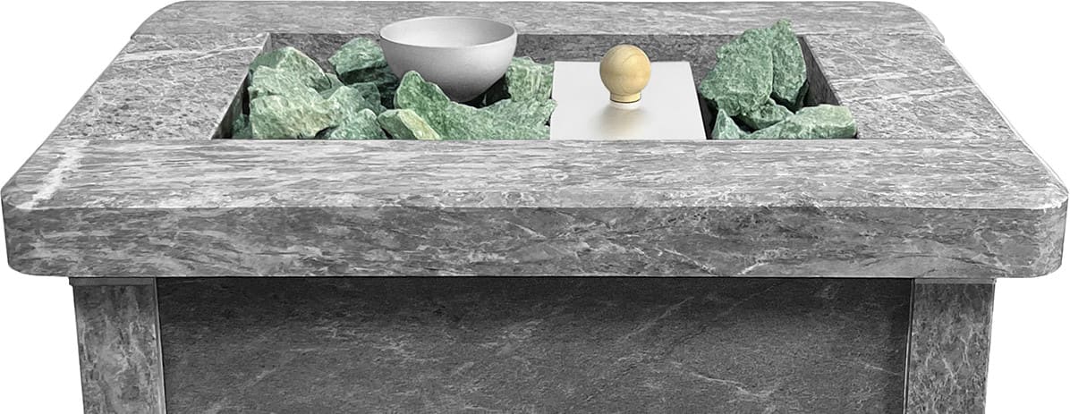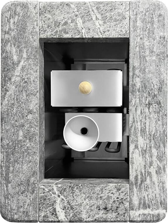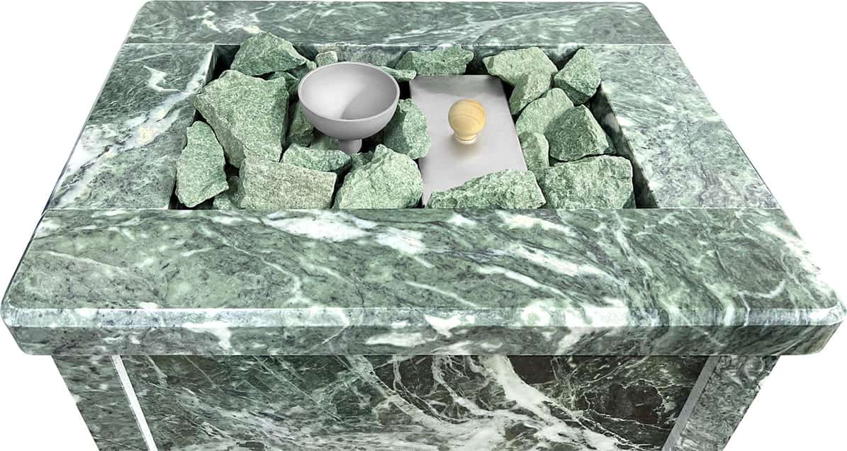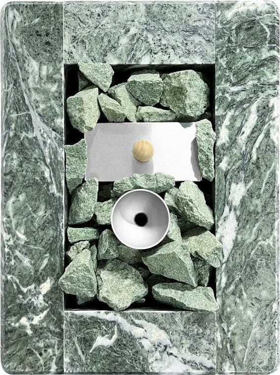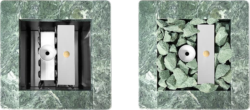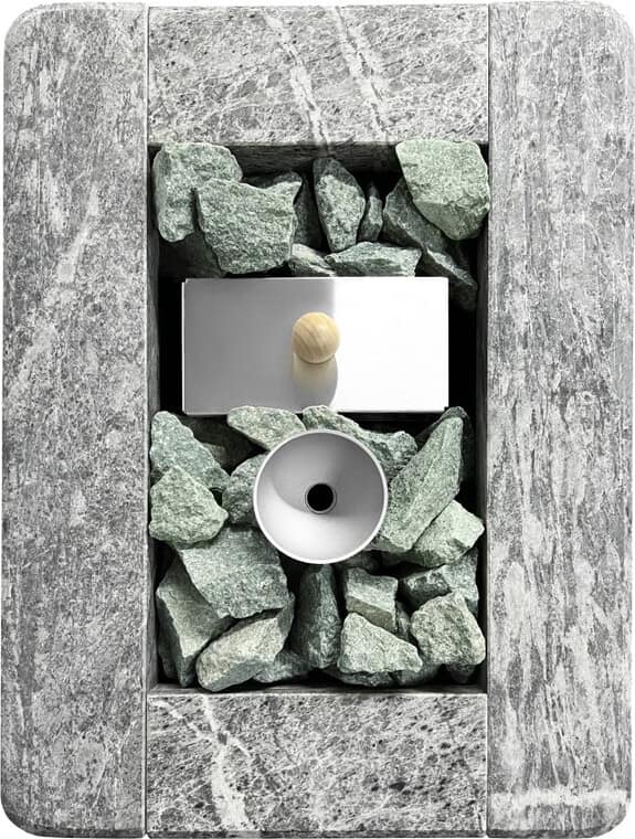 Электропечи оборудованы двумя каменками: открытая вмещает от 40 до 60 кг камней, вторая, в виде сетки с воронкой для залива воды, рассчитана на камни мелкой фракции. Этот контейнер, находясь в центре каменки между ТЭНами, из-за плотности кладки камней прогревается быстрее и способствует большему образованию мелкодисперсного пара при подаче в него воды.