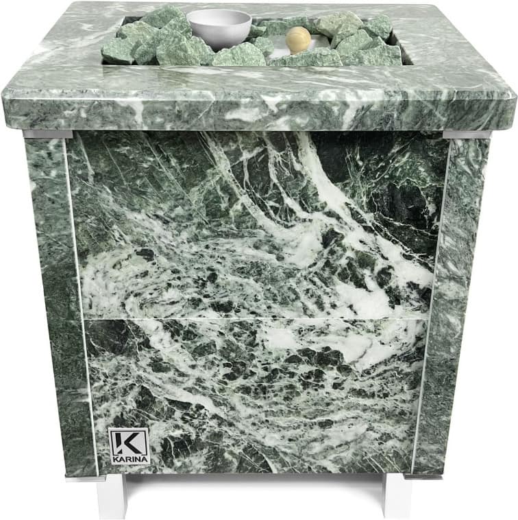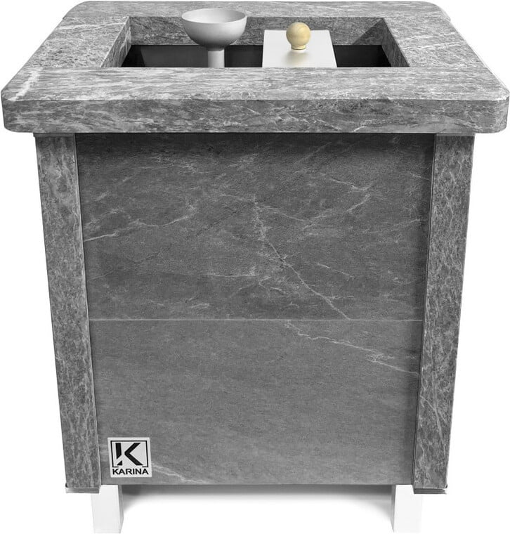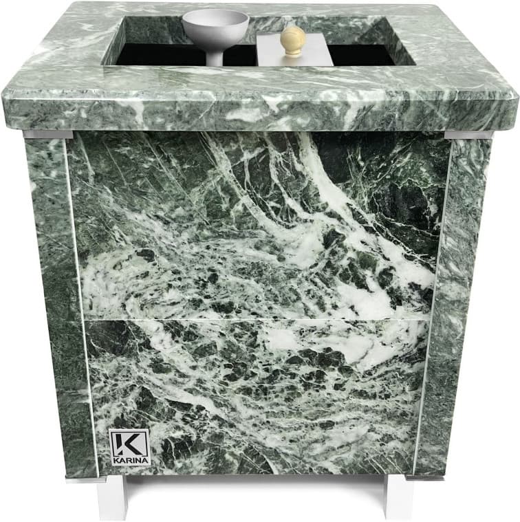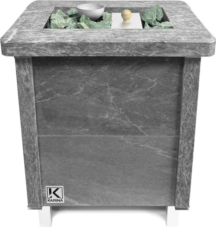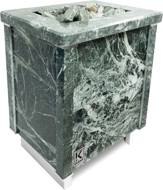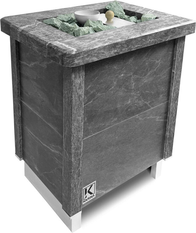 Электрические печи Karina представлены различными по внешнему виду и габаритам моделями: каменки могут быть в виде цилиндрической сетки, стильного прямоугольного кожуха без лишних деталей либо облицованы натуральным камнем. Кроме эстетического вида, облицовка защищает от жесткого инфракрасного излучения внутреннего разогретого электронагревательного блока и увеличивает теплоемкость. Материал отделки представлен плитами камня: амфиболит, змеевик, онего грин или талькохлорит.