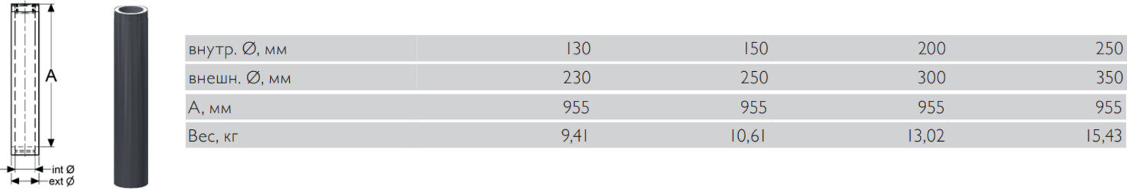 Элемент высотой 1000 мм состоит из двух труб (внешней и внутренней), между которыми располагается пожаробезопасный, термостойкий утеплитель. Внутренняя труба выполнена из нержавеющей стали AISI 444 толщиной 0.5 мм, внешняя — из нержавеющей стали AISI 304 толщиной 0.6 мм, покрытой порошковой краской.