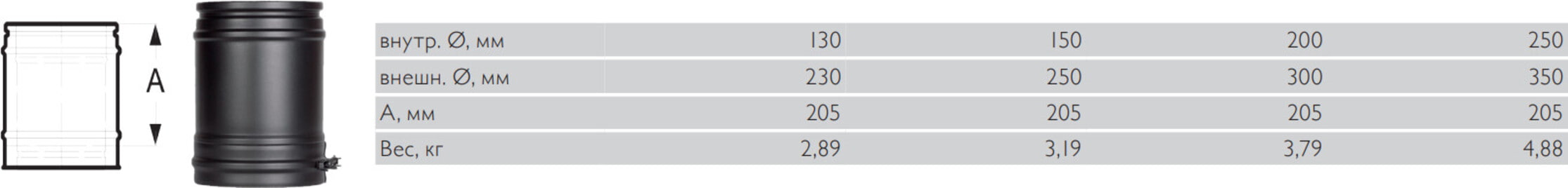 Элемент высотой 250 мм состоит из двух труб (внешней и внутренней), между которыми располагается пожаробезопасный, термостойкий утеплитель. Внутренняя труба выполнена из нержавеющей стали AISI 310S толщиной 1 мм, внешняя — из оцинкованной стали толщиной 0.6 мм и покрыта порошковой краской.