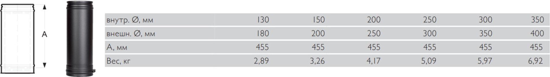 Элемент высотой 500 мм состоит из двух труб (внешней и внутренней), между которыми располагается пожаробезопасный, термостойкий утеплитель. Двухконтурная труба ("сэндвич") является одной из основных частей дымоотводной системы. Устанавливается на прямых участках вывода продуктов горения, обеспечивая требуемую высоту.