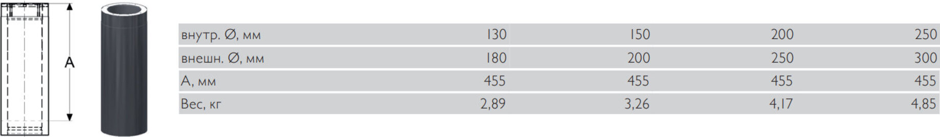 Элемент высотой 500 мм состоит из двух труб (внешней и внутренней), между которыми располагается пожаробезопасный, термостойкий утеплитель. Внутренняя труба выполнена из нержавеющей стали AISI 444 толщиной 0.5 мм, внешняя — из нержавеющей стали AISI 304 толщиной 0.6 мм, покрытой порошковой краской.