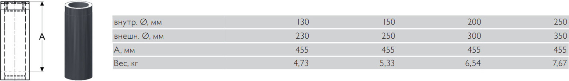 Элемент высотой 500 мм состоит из двух труб (внешней и внутренней), между которыми располагается пожаробезопасный, термостойкий утеплитель. Внутренняя труба выполнена из нержавеющей стали AISI 444 толщиной 0.5 мм, внешняя — из нержавеющей стали AISI 304 толщиной 0.6 мм, покрытой порошковой краской.