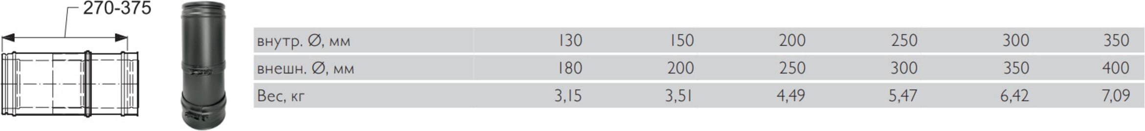 Используется изделие для подгонки длины дымоотводной системы за счет возможности регулирования размера детали от 270 до 375 мм. Телескопический элемент не рекомендуется для установки на вертикальную часть дымохода над тройником подключения.