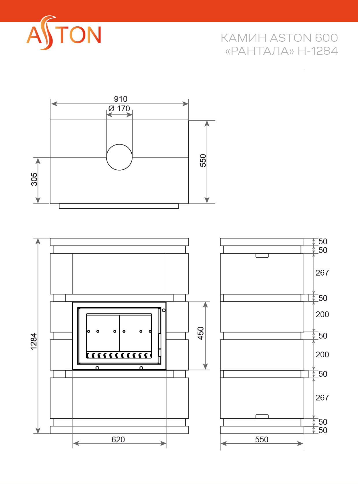 Камин Астон 600 Рантала H-1284 Талькохлорит / Пироксенит (Aston 600 "Rantala" H-1284 Талькохлорит / Пироксенит) — это полноценное теплоаккумулирующее устройство, состоящее из каминной топки "Астон 600" и адаптированной под неё облицовки "Рантала" высотой 1284 мм.