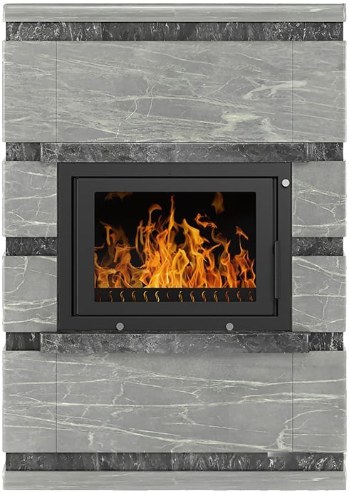 Материалом облицовки выступает натуральный талькохлорит / пироксенит толщиной 50 мм, способный долго, медленно и равномерно отдавать тепло в комнату даже после прекращения добавления дров. Индивидуальный рисунок камня дополнит любой интерьер.