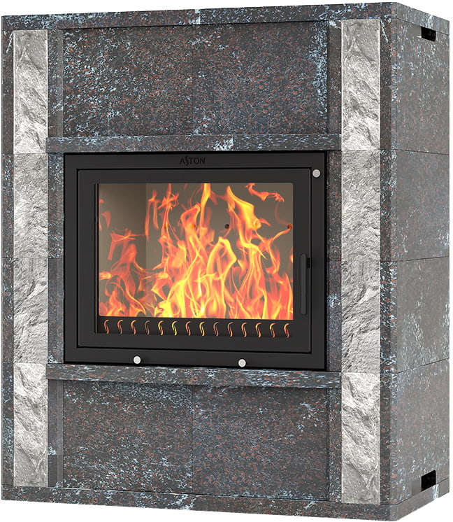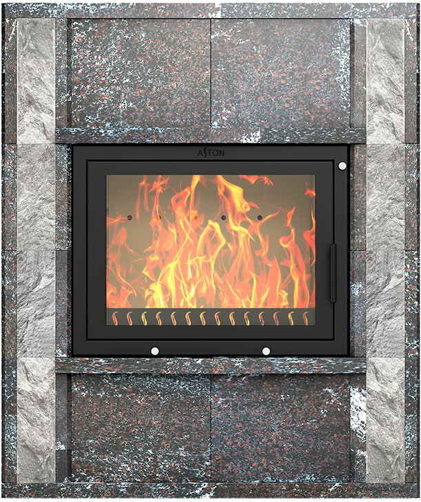 Камины Aston — это полноценные теплоаккумулирующие устройства, состоящие из каминной топки и адаптированной под неё облицовки. Материалом может выступать натуральный талькохлорит, амфиболит или пироксенит элит. Толщина облицовки — 40-50 мм. Каждый из этих камней способен долго, медленно и равномерно отдавать тепло в комнату даже после прекращения добавления дров, а индивидуальный рисунок дополнит любой интерьер.