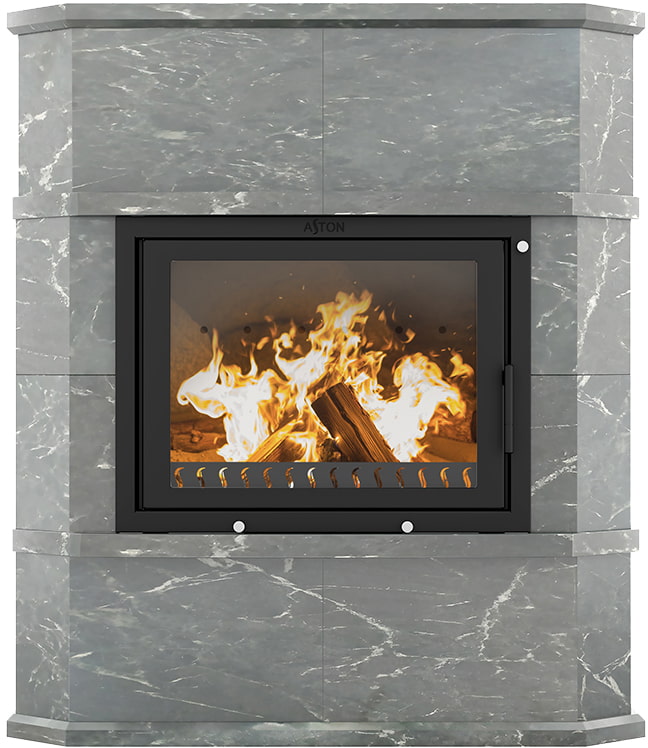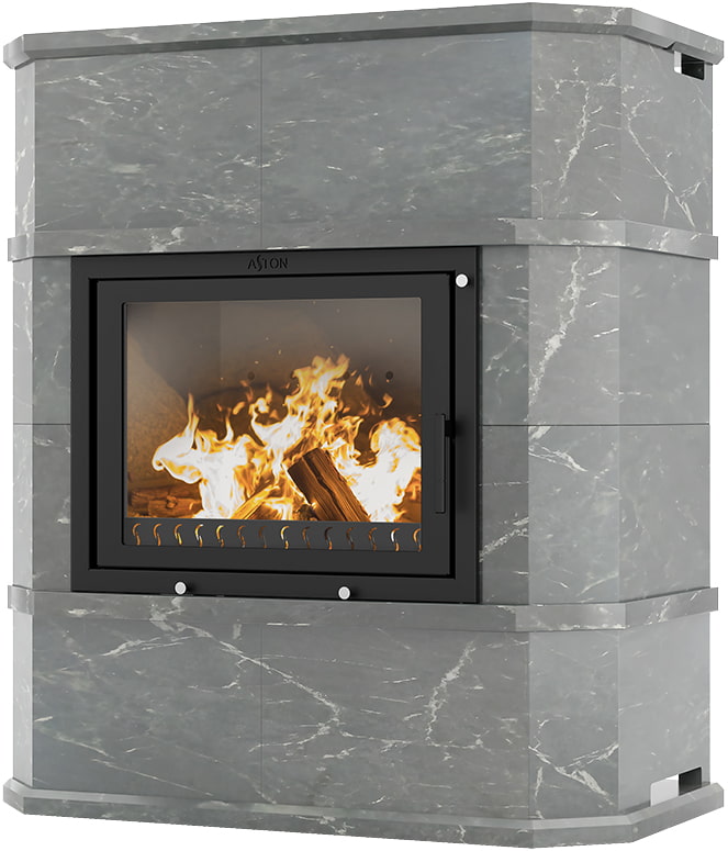 Камины Aston — это полноценные теплоаккумулирующие устройства, состоящие из каминной топки и адаптированной под неё облицовки. Материалом может выступать натуральный талькохлорит, амфиболит или пироксенит элит. Толщина облицовки — 40-50 мм. Каждый из этих камней способен долго, медленно и равномерно отдавать тепло в комнату даже после прекращения добавления дров, а индивидуальный рисунок дополнит любой интерьер.