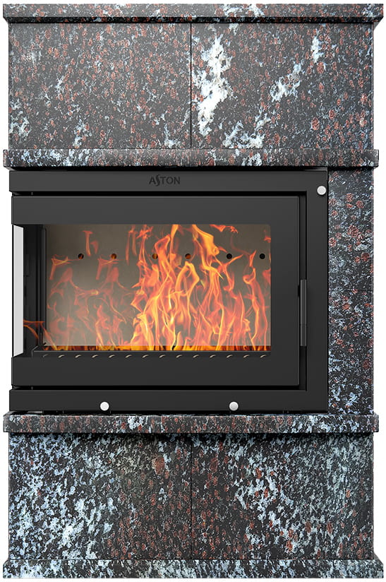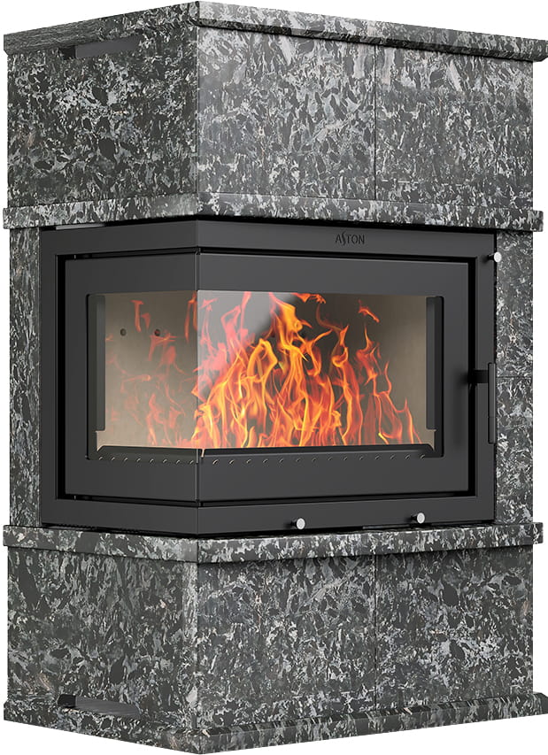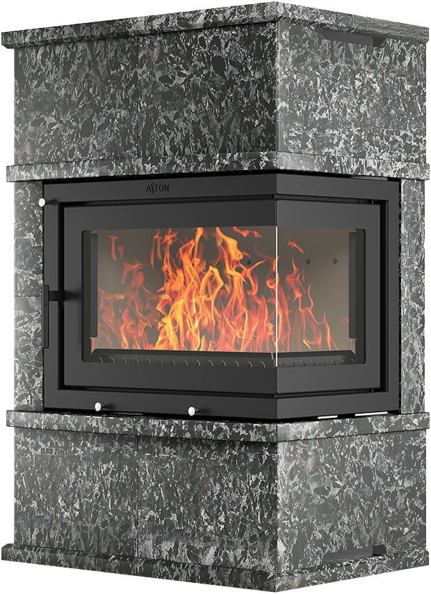 Камины Aston — это полноценные теплоаккумулирующие устройства, состоящие из каминной топки и адаптированной под неё облицовки. Материалом может выступать натуральный талькохлорит, амфиболит или пироксенит элит. Толщина облицовки — 40-50 мм. Каждый из этих камней способен долго, медленно и равномерно отдавать тепло в комнату даже после прекращения добавления дров, а индивидуальный рисунок дополнит любой интерьер.
