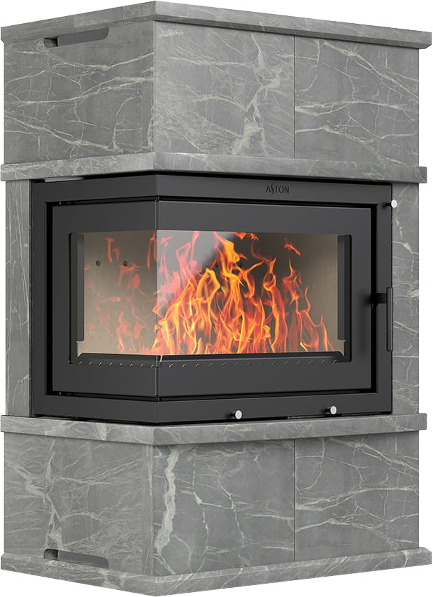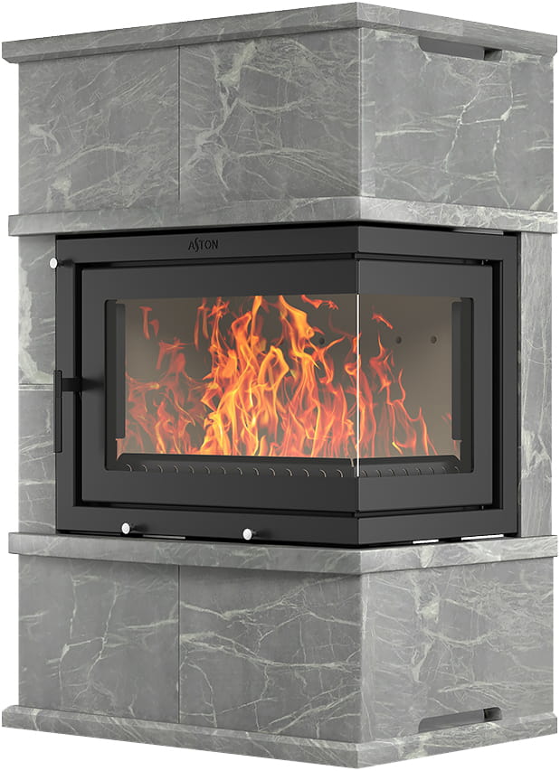 Камины Aston — это полноценные теплоаккумулирующие устройства, состоящие из каминной топки и адаптированной под неё облицовки. Материалом может выступать натуральный талькохлорит, амфиболит или пироксенит элит. Толщина облицовки — 40-50 мм. Каждый из этих камней способен долго, медленно и равномерно отдавать тепло в комнату даже после прекращения добавления дров, а индивидуальный рисунок дополнит любой интерьер.