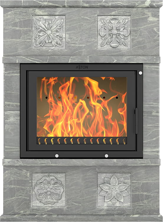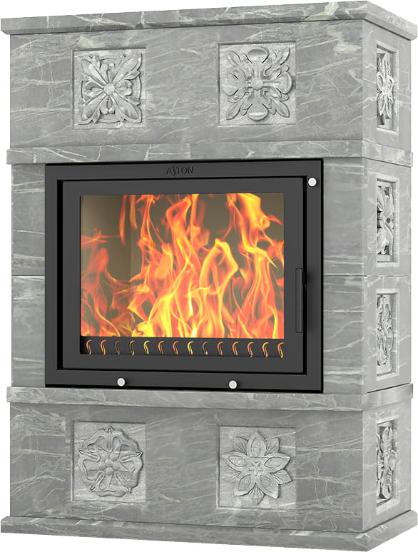Камины Aston — это полноценные теплоаккумулирующие устройства, состоящие из каминной топки и адаптированной под неё облицовки. Материалом может выступать натуральный талькохлорит, амфиболит или пироксенит элит. Толщина облицовки — 40-50 мм. Каждый из этих камней способен долго, медленно и равномерно отдавать тепло в комнату даже после прекращения добавления дров, а индивидуальный рисунок дополнит любой интерьер.