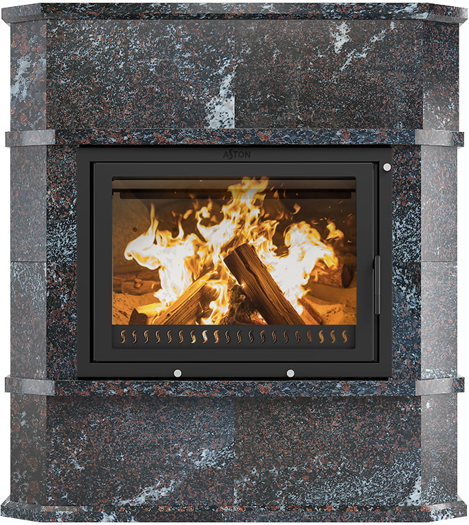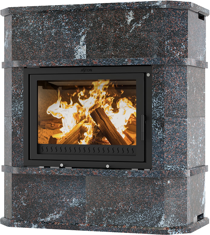 Камины Aston — это полноценные теплоаккумулирующие устройства, состоящие из каминной топки и адаптированной под неё облицовки. Материалом может выступать натуральный талькохлорит, амфиболит или пироксенит элит. Толщина облицовки — 40-50 мм. Каждый из этих камней способен долго, медленно и равномерно отдавать тепло в комнату даже после прекращения добавления дров, а индивидуальный рисунок дополнит любой интерьер.