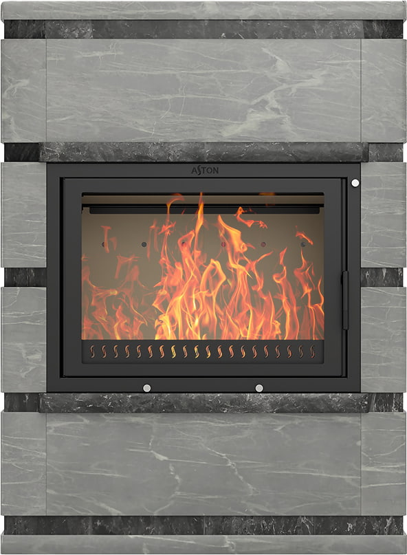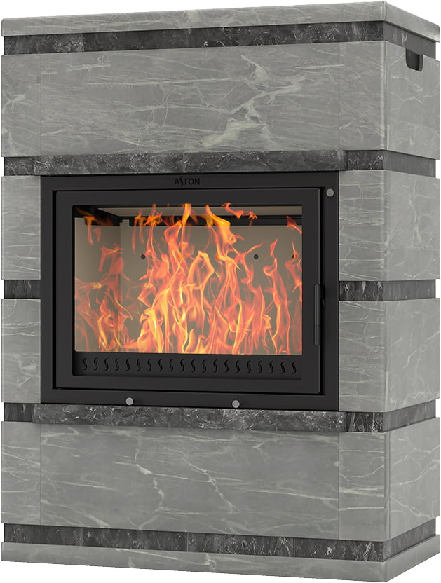 Камины Aston — это полноценные теплоаккумулирующие устройства, состоящие из каминной топки и адаптированной под неё облицовки. Материалом может выступать натуральный талькохлорит, амфиболит или пироксенит элит. Толщина облицовки — 40-50 мм. Каждый из этих камней способен долго, медленно и равномерно отдавать тепло в комнату даже после прекращения добавления дров, а индивидуальный рисунок дополнит любой интерьер.