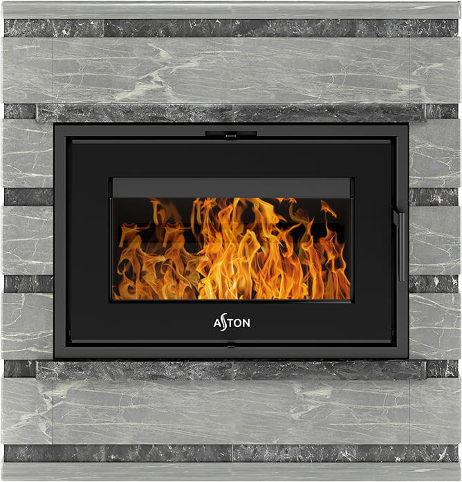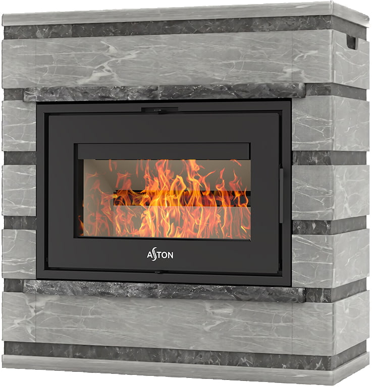 Камины Aston — это полноценные теплоаккумулирующие устройства, состоящие из каминной топки и адаптированной под неё облицовки. Материалом может выступать натуральный талькохлорит, амфиболит или пироксенит элит. Толщина облицовки — 40-50 мм. Каждый из этих камней способен долго, медленно и равномерно отдавать тепло в комнату даже после прекращения добавления дров, а индивидуальный рисунок дополнит любой интерьер.