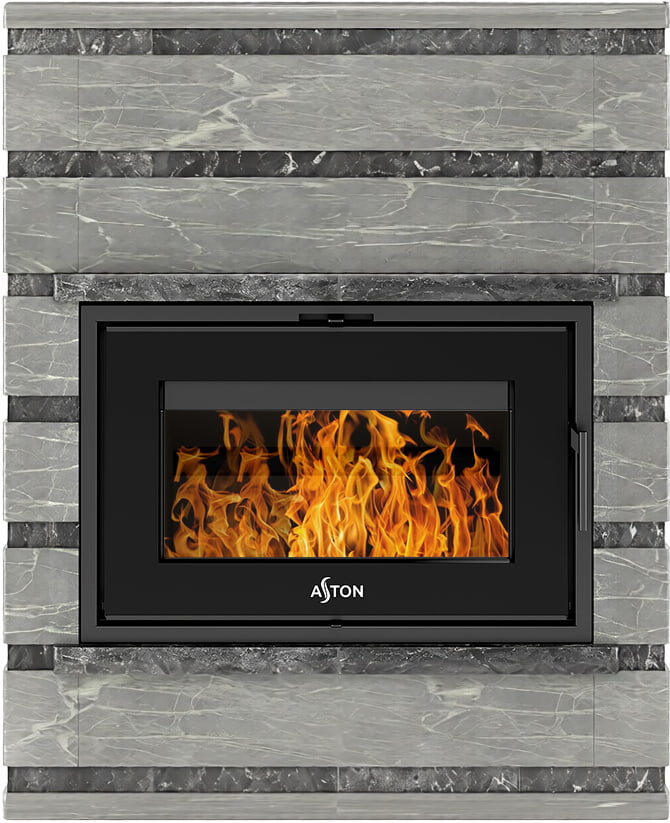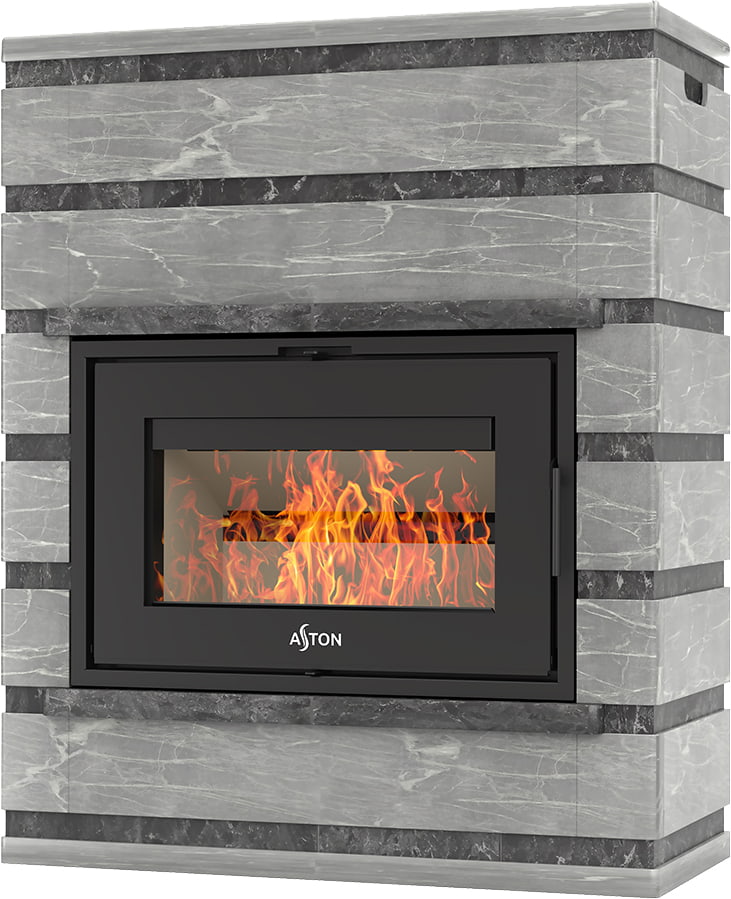 Камины Aston — это полноценные теплоаккумулирующие устройства, состоящие из каминной топки и адаптированной под неё облицовки. Материалом может выступать натуральный талькохлорит, амфиболит или пироксенит элит. Толщина облицовки — 40-50 мм. Каждый из этих камней способен долго, медленно и равномерно отдавать тепло в комнату даже после прекращения добавления дров, а индивидуальный рисунок дополнит любой интерьер.