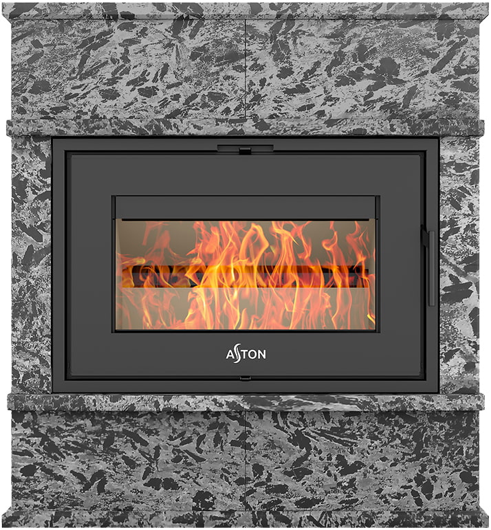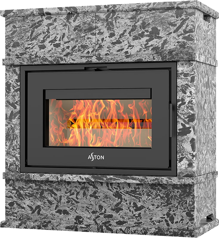 Камины Aston — это полноценные теплоаккумулирующие устройства, состоящие из каминной топки и адаптированной под неё облицовки. Материалом может выступать натуральный талькохлорит, амфиболит или пироксенит элит. Толщина облицовки — 40-50 мм. Каждый из этих камней способен долго, медленно и равномерно отдавать тепло в комнату даже после прекращения добавления дров, а индивидуальный рисунок дополнит любой интерьер.