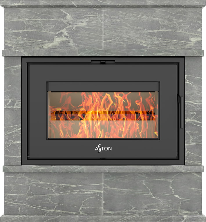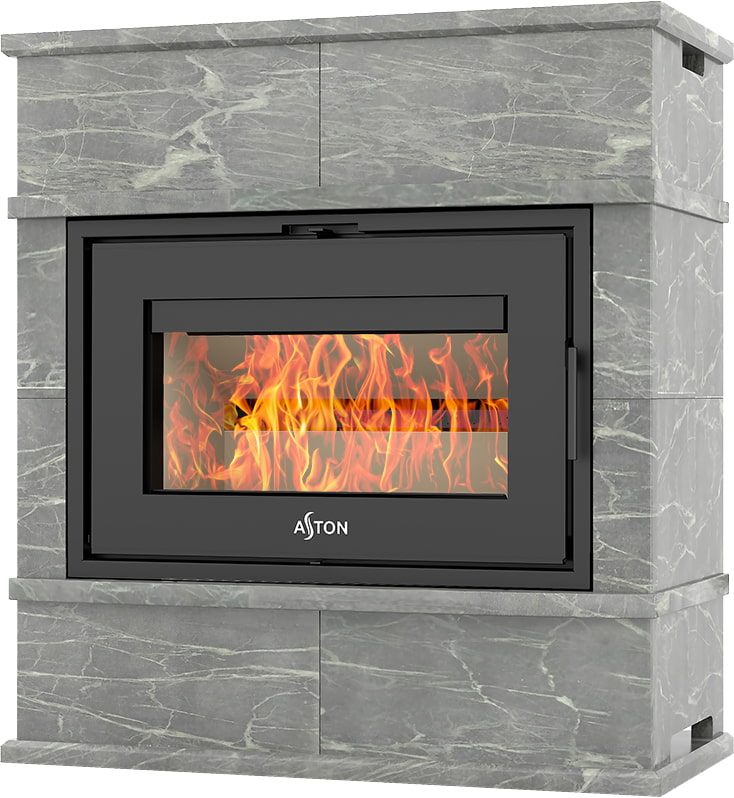 Камины Aston — это полноценные теплоаккумулирующие устройства, состоящие из каминной топки и адаптированной под неё облицовки. Материалом может выступать натуральный талькохлорит, амфиболит или пироксенит элит. Толщина облицовки — 40-50 мм. Каждый из этих камней способен долго, медленно и равномерно отдавать тепло в комнату даже после прекращения добавления дров, а индивидуальный рисунок дополнит любой интерьер.
