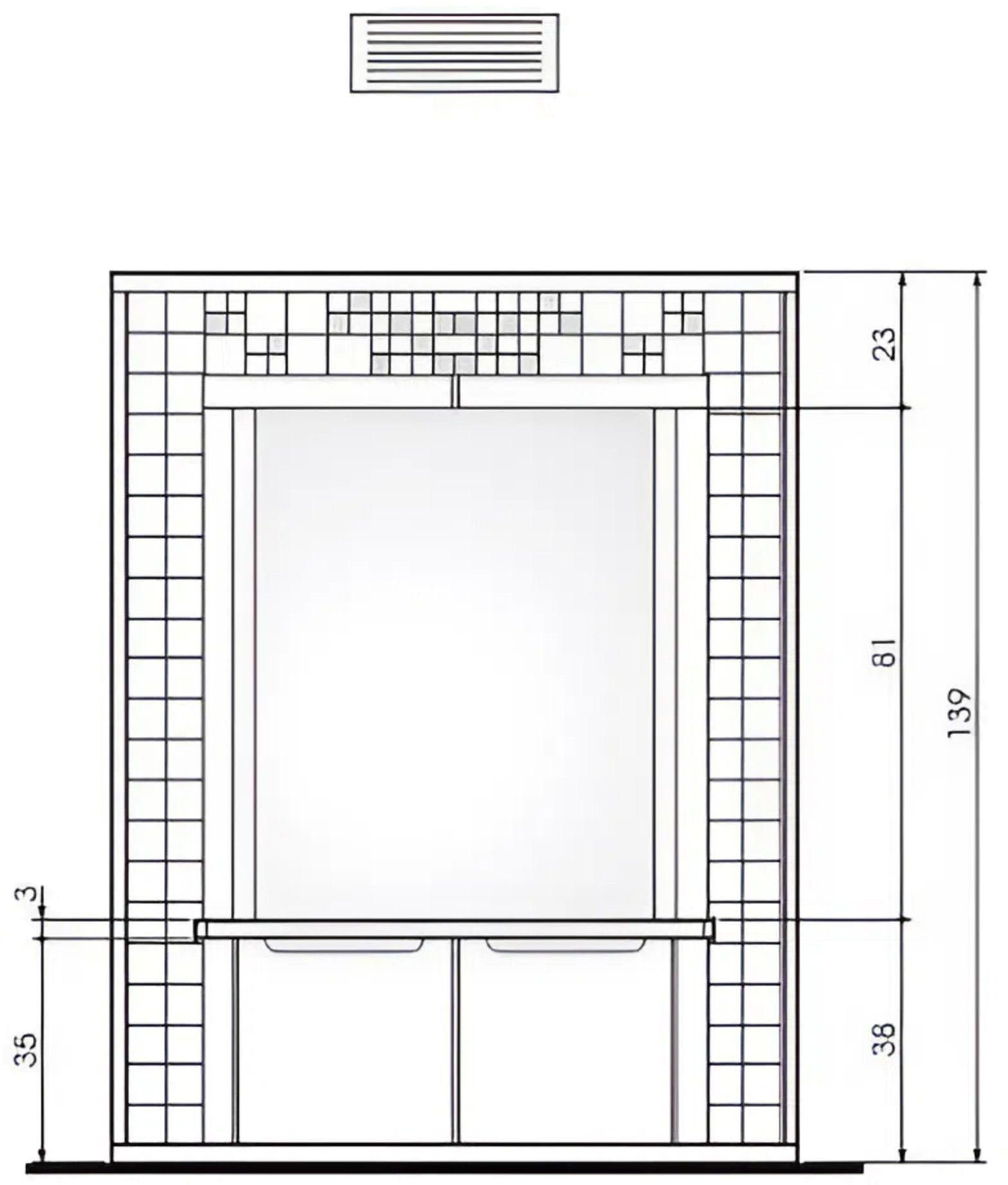 В комплекте также идёт топка EdilKamin Stile N Piano — закрытая модель с прямым стеклом, подъёмной дверцей и футеровкой из огнеупороного кирпича мощностью 13 кВт. КПД устройства — 71%. Для отвода продуктов сгорания необходим дымоход диаметром 200 мм.