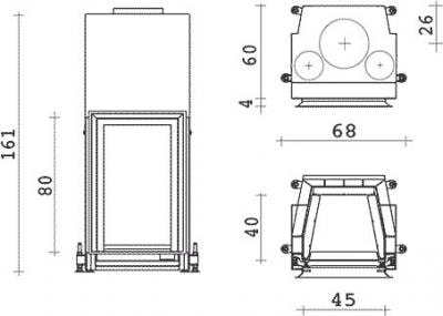 В комплекте также идёт топка EdilKamin Cristal 45 N — вертикально-вытянутая закрытая модель с футеровкой из керамики мощностью 10 кВт КПД устройства — 78%. Для отвода продуктов сгорания необходим дымоход диаметром 200 мм.