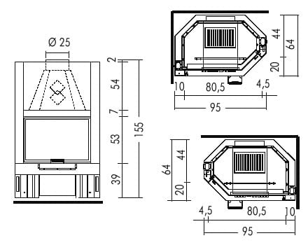 В комплекте также идёт топка EdilKamin Tekno 2N SX — закрытая модель с двумя стеклами, подъёмной дверцей, футеровкой из чугуна мощностью 15 кВт. КПД устройства — 72%. Для отвода продуктов сгорания необходим дымоход диаметром 250 мм.