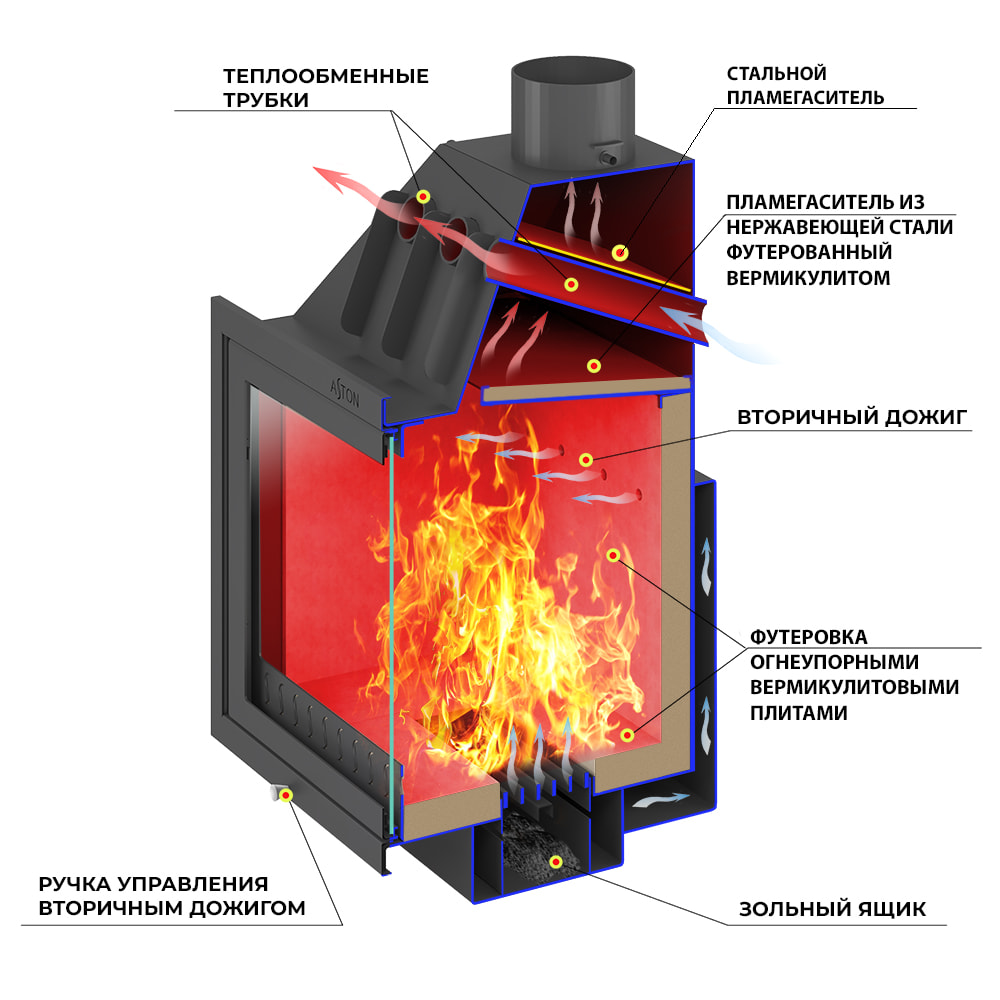 Каминные топки Aston — доступные отечественные отопительные устройства, выполненные из особо прочной котловой стали 09Г2С. Диапазон номинальной мощности модельного ряда: от 10 до 15 кВт, чего достаточно для помещений объемом от 200 до 330 м³.