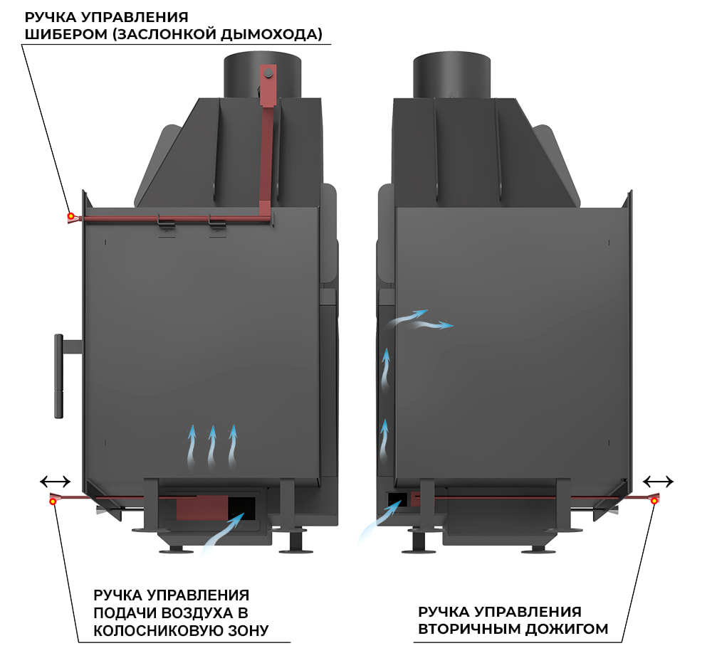 Во всех очагах реализован дополнительный дожиг газов: по воздушным каналам на заднюю стенку топки подаётся дополнительный воздух, который перемешивается с дымовыми газами, что и вызывает их дополнительное горение. Модели оснащены колосниковым типом горения, поворотным шибером и высоким дымосборником. Внутри дымосборника размещены три или четыре теплообменные трубки, которые увеличивают скорость нагретого воздуха и усиливают конвекцию изделий.