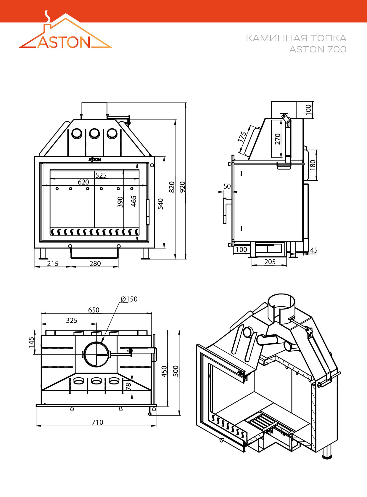Каминная топка Астон 700 (Aston 700) выполнена из котловой стали 09Г2С. Мощность изделия составляет 14 кВт, чего хватает для обогрева помещения объёмом 280 м³. У модели прямое керамическое стекло. Дверца топки, шириной 620 мм и высотой 465 мм, с боковым открыванием. За стеклом предусмотрен ограничитель, предотвращающий выпадение дров.
