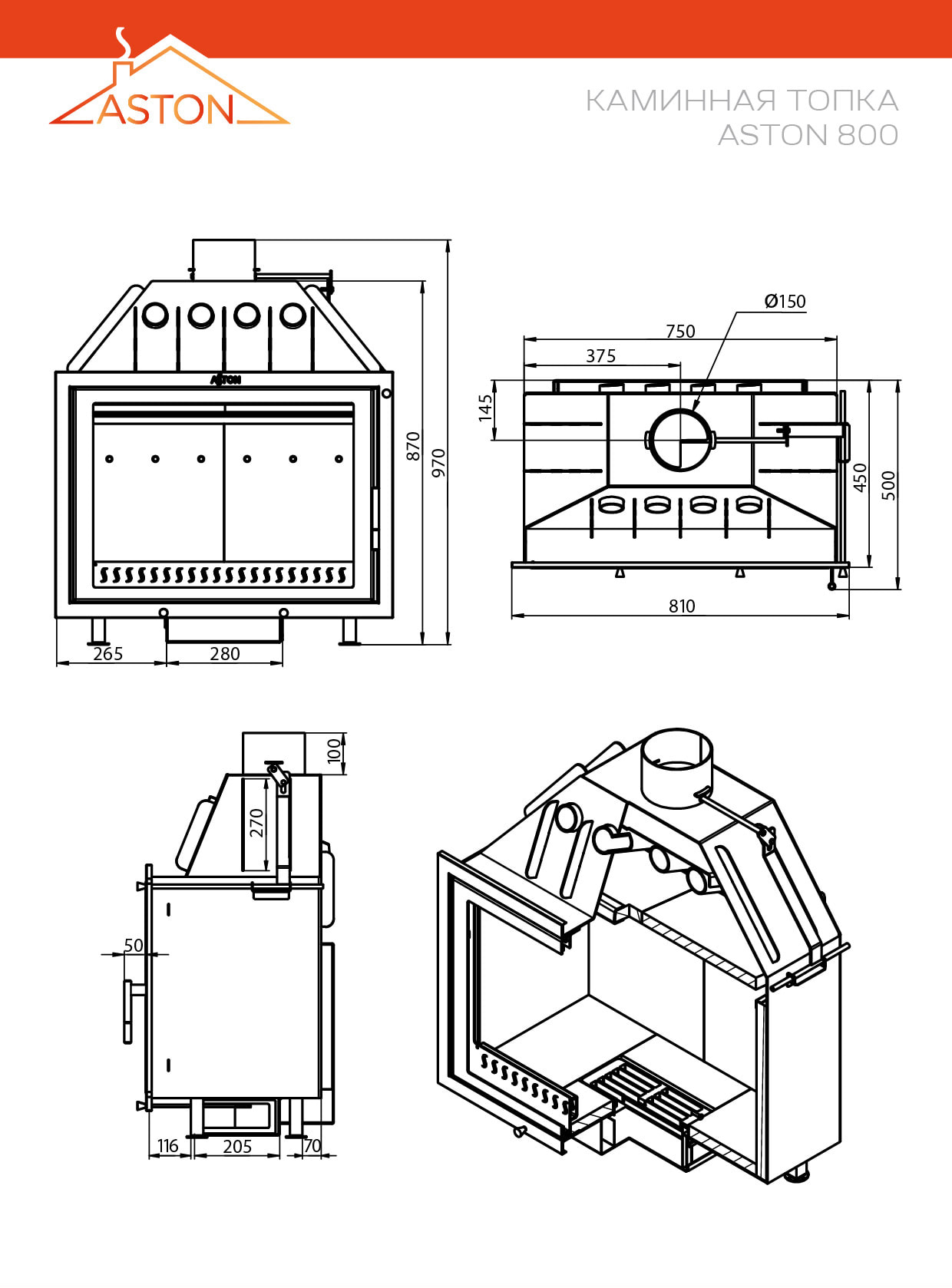 Каминная топка Астон 800 (Aston 800) выполнена из котловой стали 09Г2С. Мощность изделия составляет 15 кВт, чего хватает для обогрева помещения объёмом 330 м³. У модели прямое керамическое стекло. Дверца топки, шириной 720 мм и высотой 515 мм, с боковым открыванием. За стеклом предусмотрен ограничитель, предотвращающий выпадение дров.