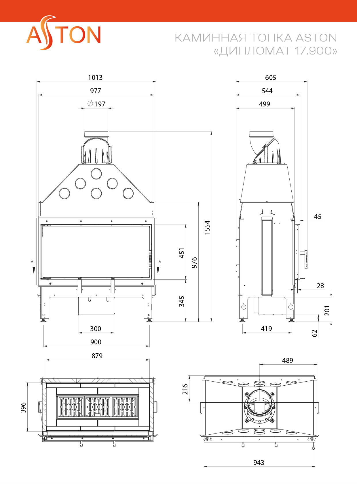 Каминная топка Астон Дипломат 17.900 (Aston Diplomat 17.900) выполнена из котловой стали 20К. Мощность изделия составляет 17 кВт, чего хватает для обогрева помещения объёмом 425 м³. КПД — 79%. У модели прямое стекло Neoceram, выдерживающее температуру 800 °C. Дверца топки шириной 943 мм и высотой 451 мм с боковым открыванием.