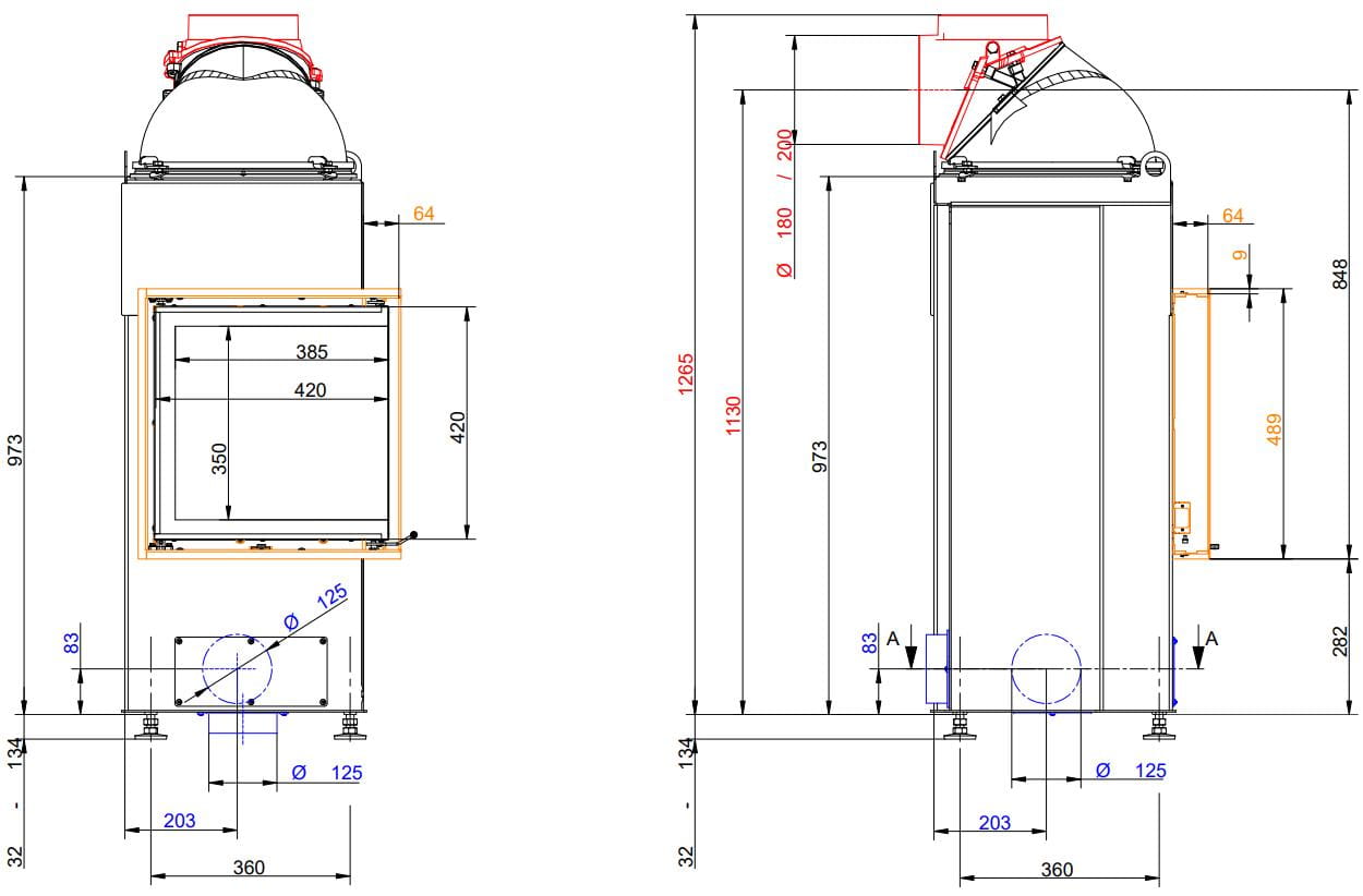 Топочная камера футерована шамотом светлого цвета, который можно заменить на чёрный чугун. Модель с инновационной чашевидной подовой (безколосниковой) системой горения. Топка обладает всеми современными технологиями горения: вторичный дожиг газов и система "Чистое стекло". Очаг с возможностью притока воздуха извне. Для отвода продуктов сгорания необходим дымоход диаметром 200 или 180 мм. Гарантия — 5 лет.