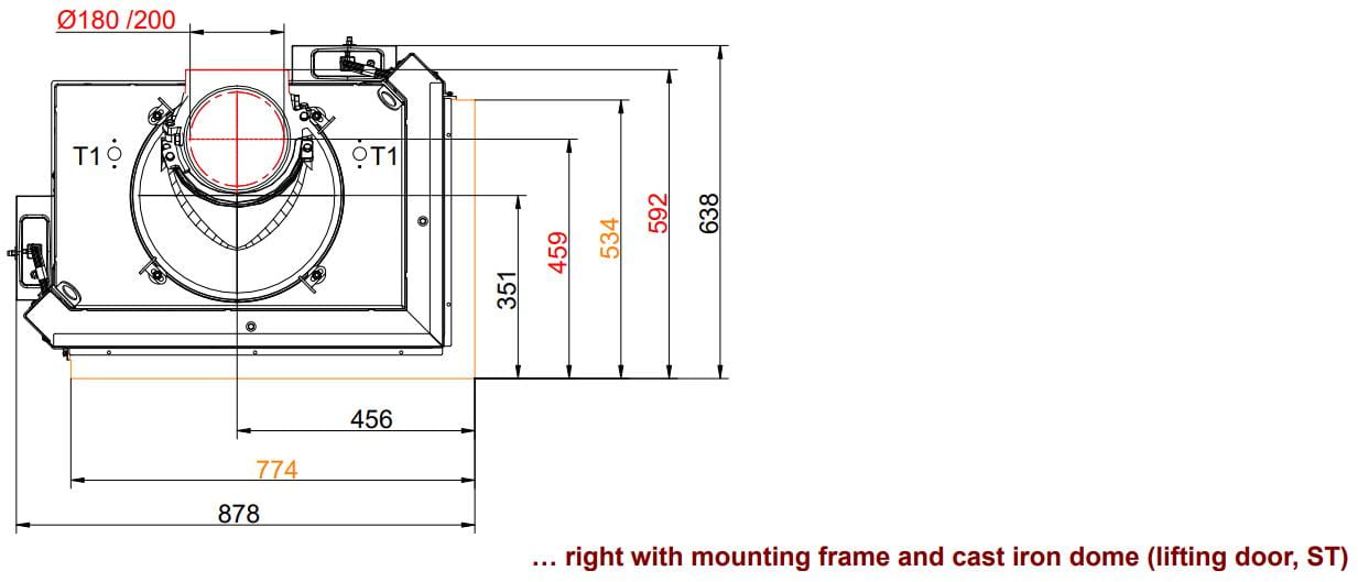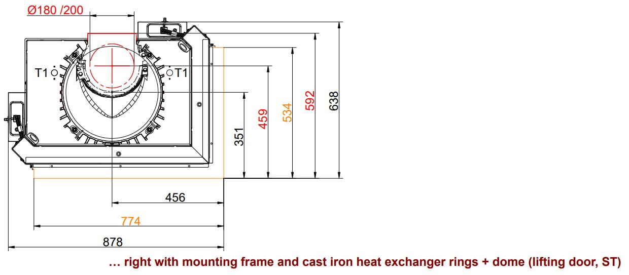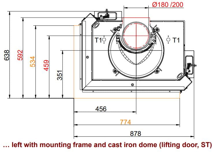 Топочная камера футерована шамотом светлого цвета, который можно заменить на чёрный чугун. Модель с инновационной чашевидной подовой (безколосниковой) системой горения. Топка обладает всеми современными технологиями горения: вторичный дожиг газов и система "Чистое стекло". Очаг с возможностью притока воздуха извне. Для отвода продуктов сгорания необходим дымоход диаметром 200 или 180 мм. Гарантия — 5 лет.