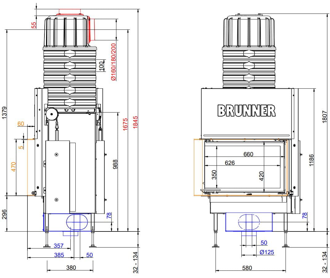 Все топки Brunner оснащены современными системами горения: вторичный (дополнительный) дожиг газов, повышающий эффективность горения, и система "Чистое стекло" — по специальным каналам происходит обдув стекла, что обеспечивает его чистоту.