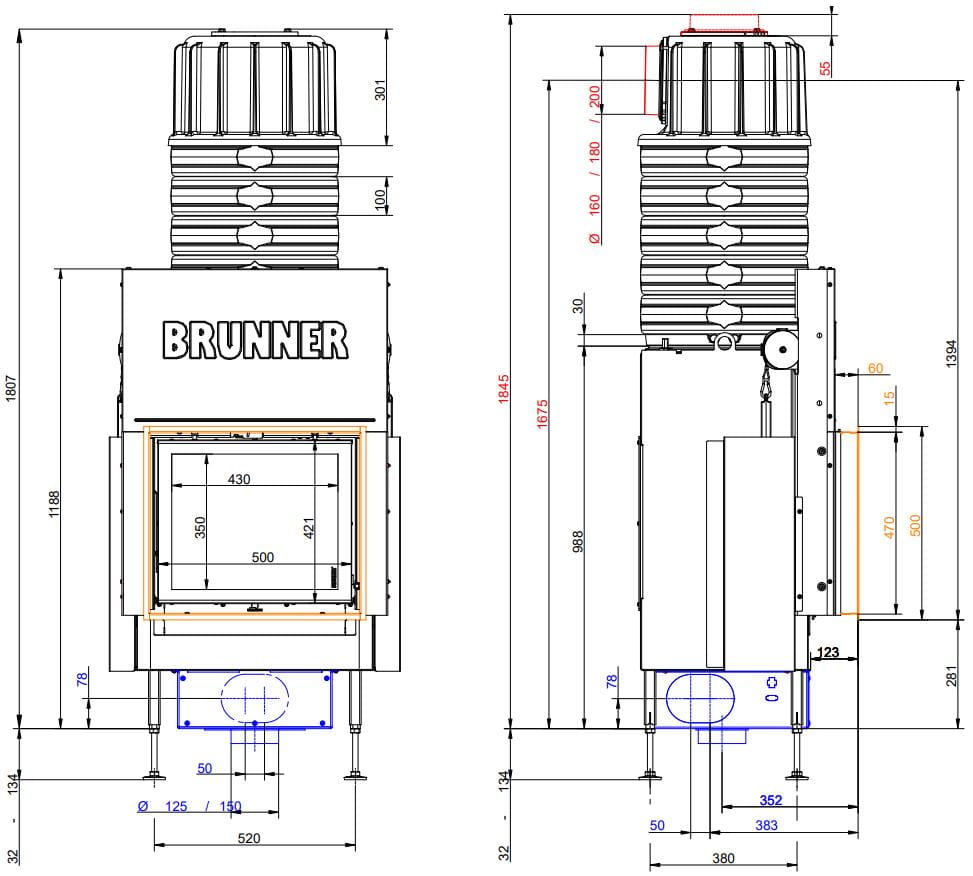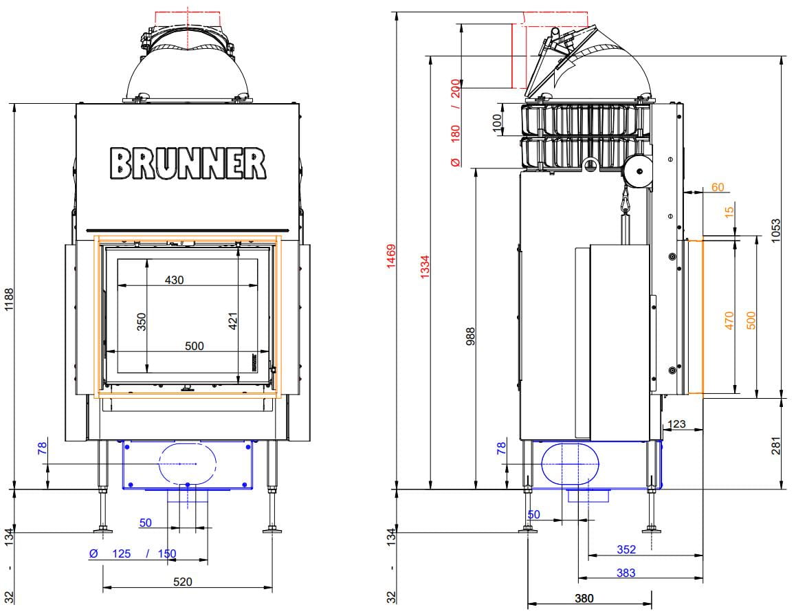 Все топки Brunner оснащены современными системами горения: вторичный (дополнительный) дожиг газов, повышающий эффективность горения, и система "Чистое стекло" — по специальным каналам происходит обдув стекла, что обеспечивает его чистоту.